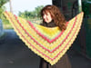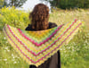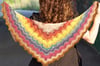 This pattern was inspired by some handspun gradient yarn. I wanted to use all of the yarn and show off the colors, and so this V-shaped shawl with a modified feather-and-fan pattern was born.