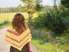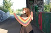 It can be knit in any weight of yarn. The large sample was knit with 1 skein of Noro Kureyon Sock and is ~52” wide and 21” deep.