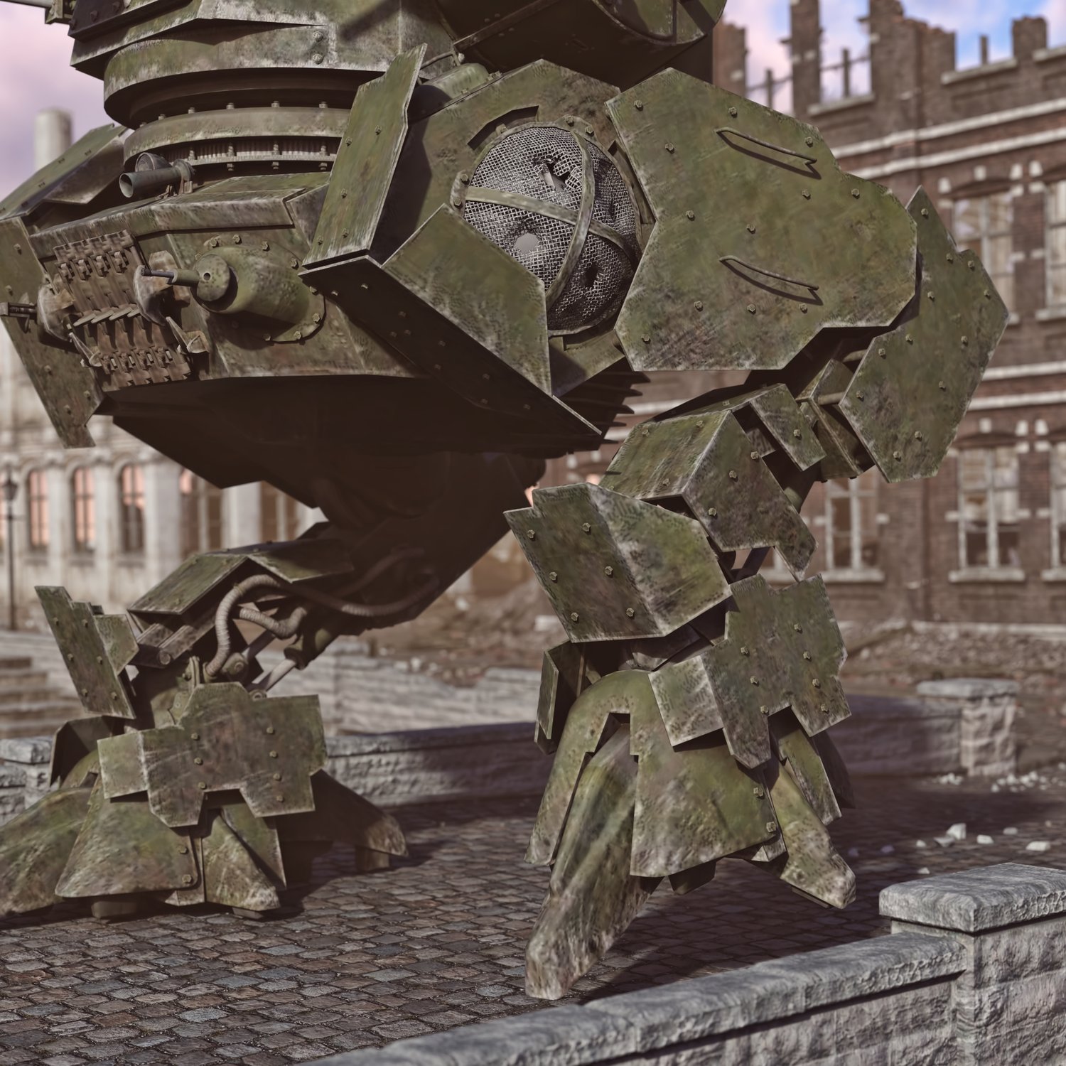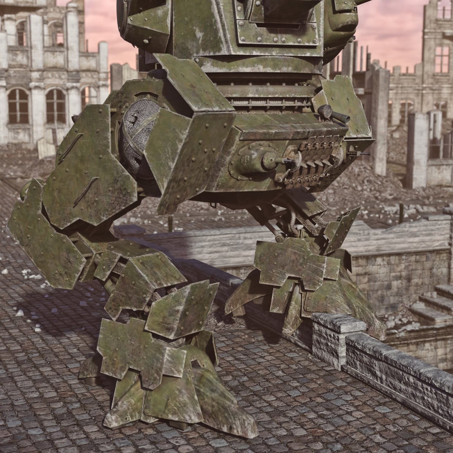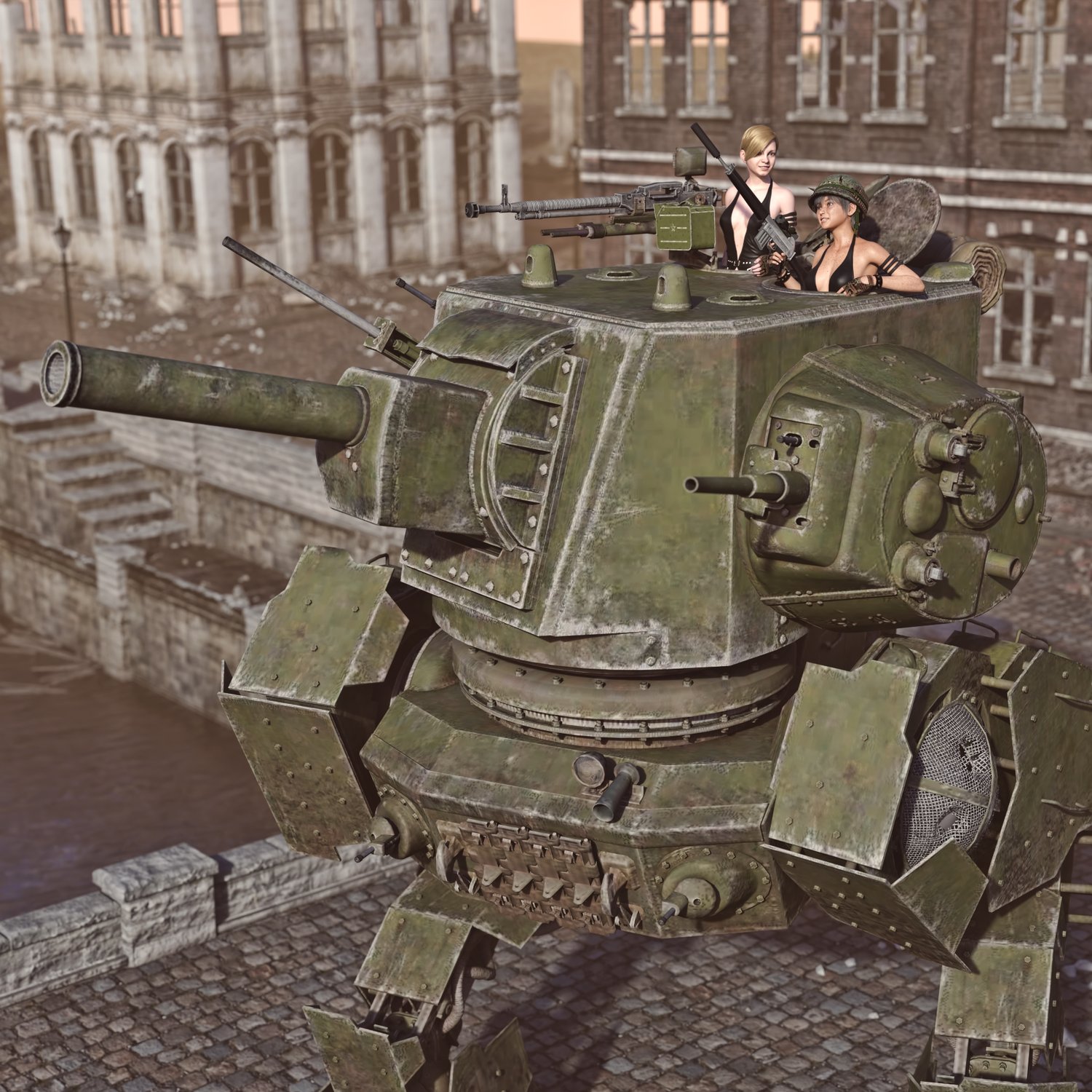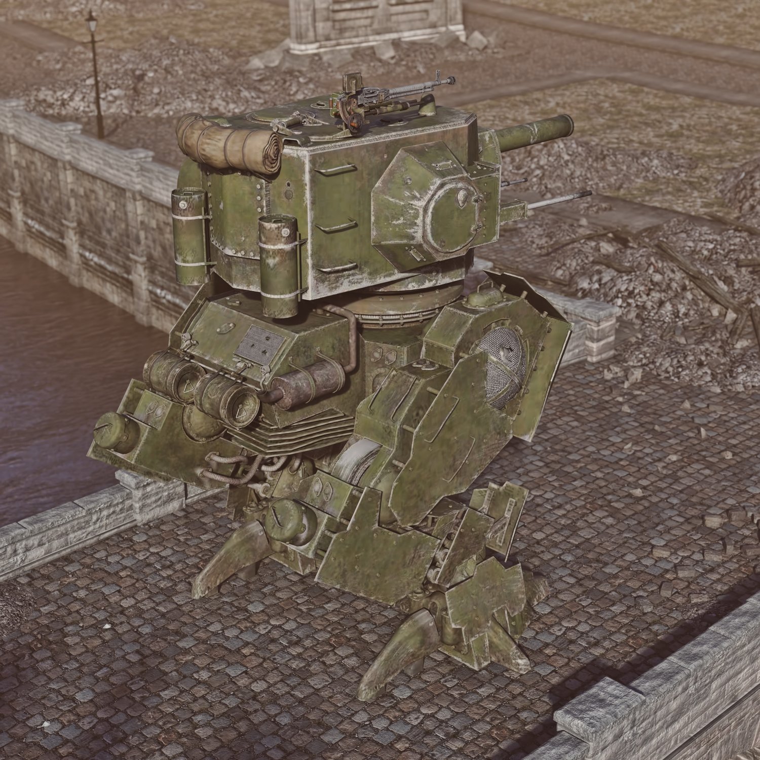 I don't have something smart to write about this one. It's tank on legs :D And with turrets and guns. Lots of turrets and guns. Developed probably in an alternative USSR to increase firepower during battle or to provide fire support to something even bigger, with more turrets and guns :). Upper hatches are rigged, but the turrets have no internals, so keep that in mind. The MG hatch can be opened and closed, but there is no hole, since the geometry doesn't allow that and I didn't manage to make a good looking one. The guns and the Machineguns are rigged too. Lags, "torso" turrets are also movable for cool pics. The prop is converted and rigged for DAZ.