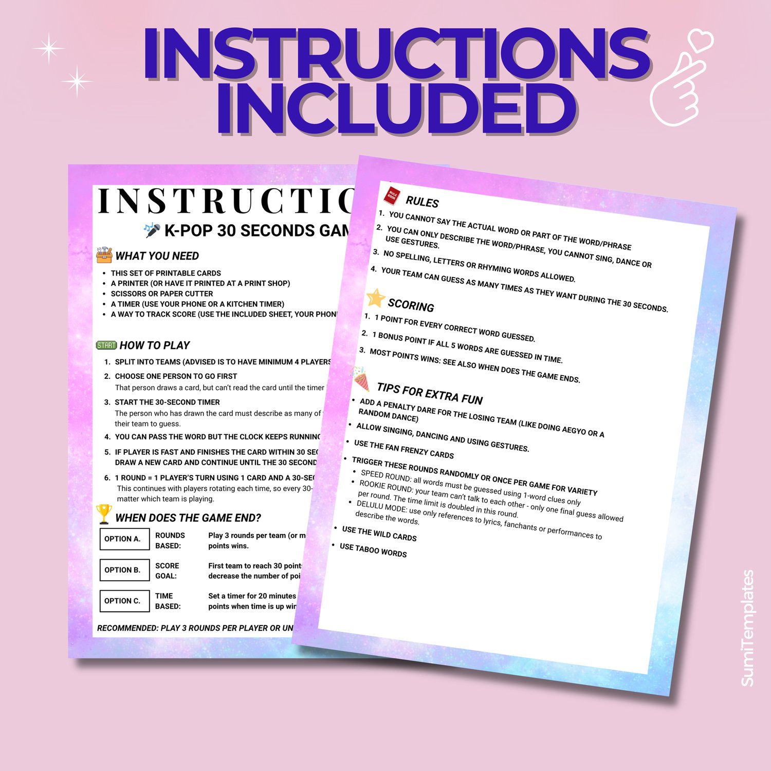 Ready to prove your K-pop knowledge under pressure? This fun and fast-paced printable game is perfect for K-pop fans of all ages. Just print, play, and guess as many K-pop-related words as you can in 30 seconds — using only your voice (no dancing or acting allowed)!