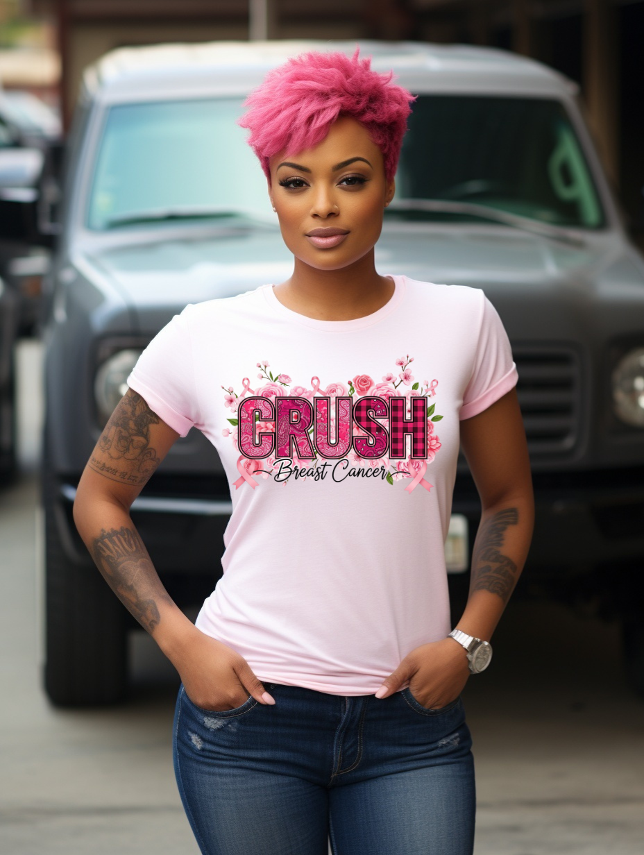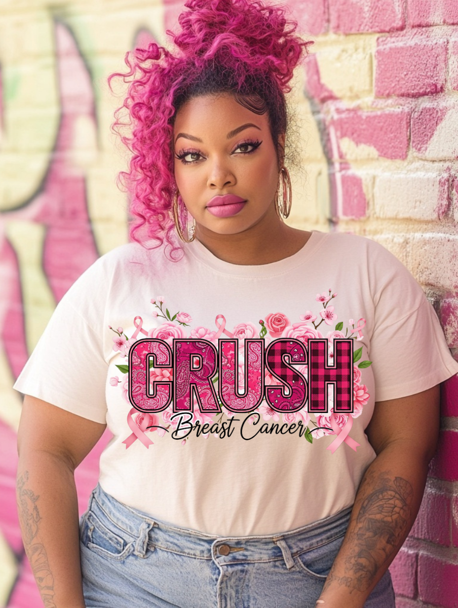 Spread strength, hope, and determination with this Crush Breast Cancer digital design. Featuring bold pink plaid and paisley lettering surrounded by beautiful pink flowers and awareness ribbons, this design is perfect for showing support during Breast Cancer Awareness Month, fundraisers, and survivor gifts.