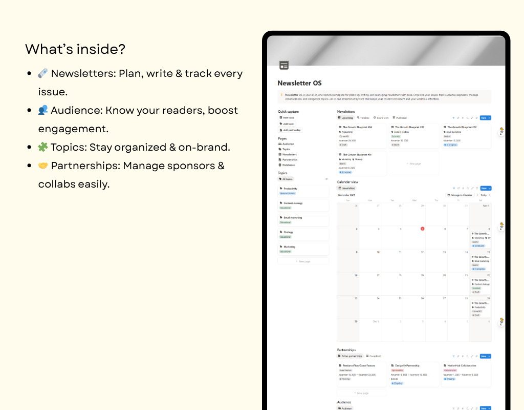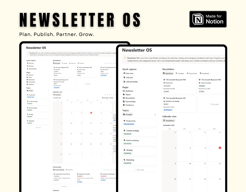 The Newsletter OS is your all-in-one Notion workspace to plan, create, and manage newsletters with clarity and control. Whether you publish weekly insights, brand updates, or educational content, this system keeps every issue organized from idea to delivery.