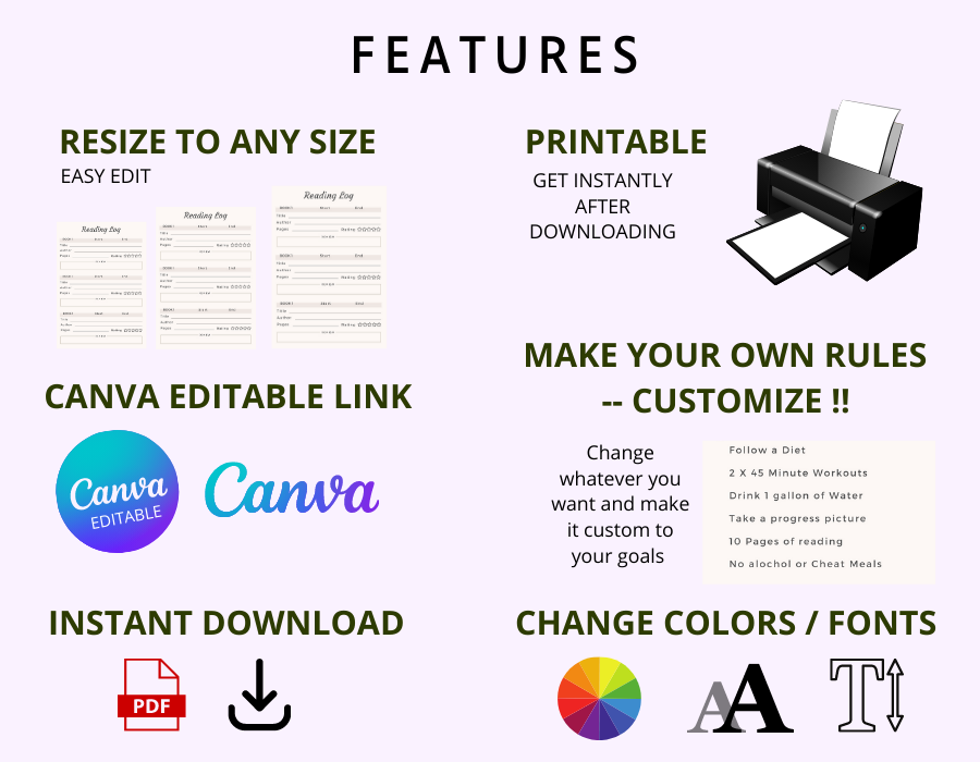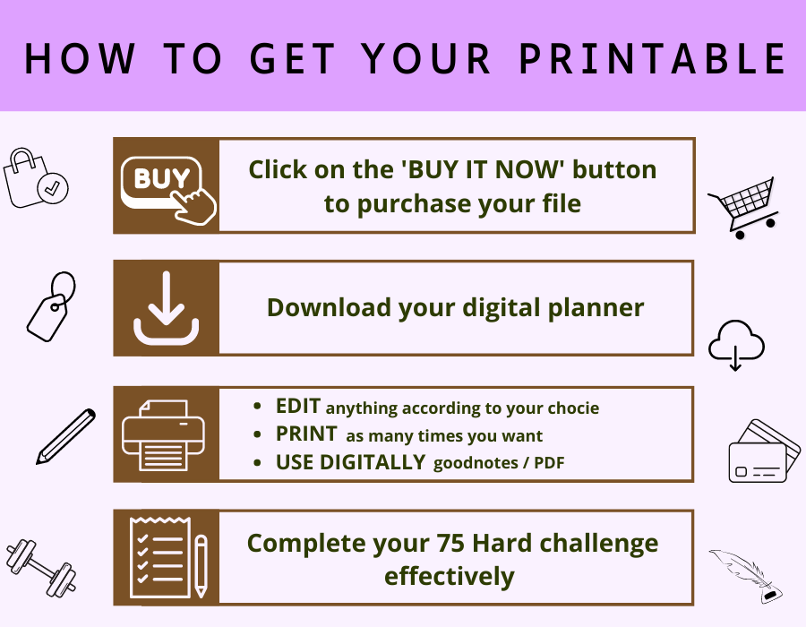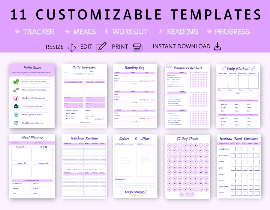 This bundle includes 11 printable and fillable templates to motivate you and track your journey throughout the 75 days. It's a digital download, which means you'll have access to it within seconds of purchasing. Simple & Convenient!'