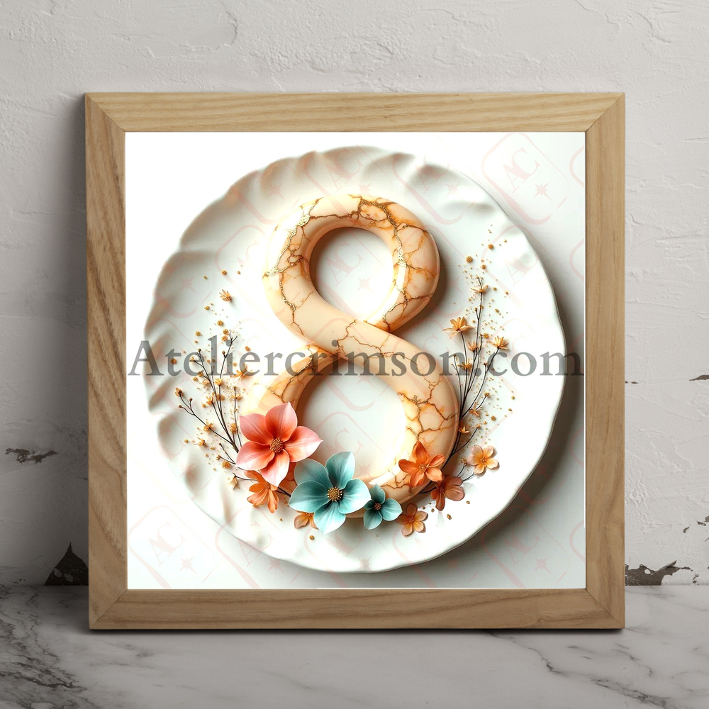 Number 8 flowers and procelaine .Download Now this high quality AI-generated image, perfect for adding a touch of tranquility and creativity to any space.