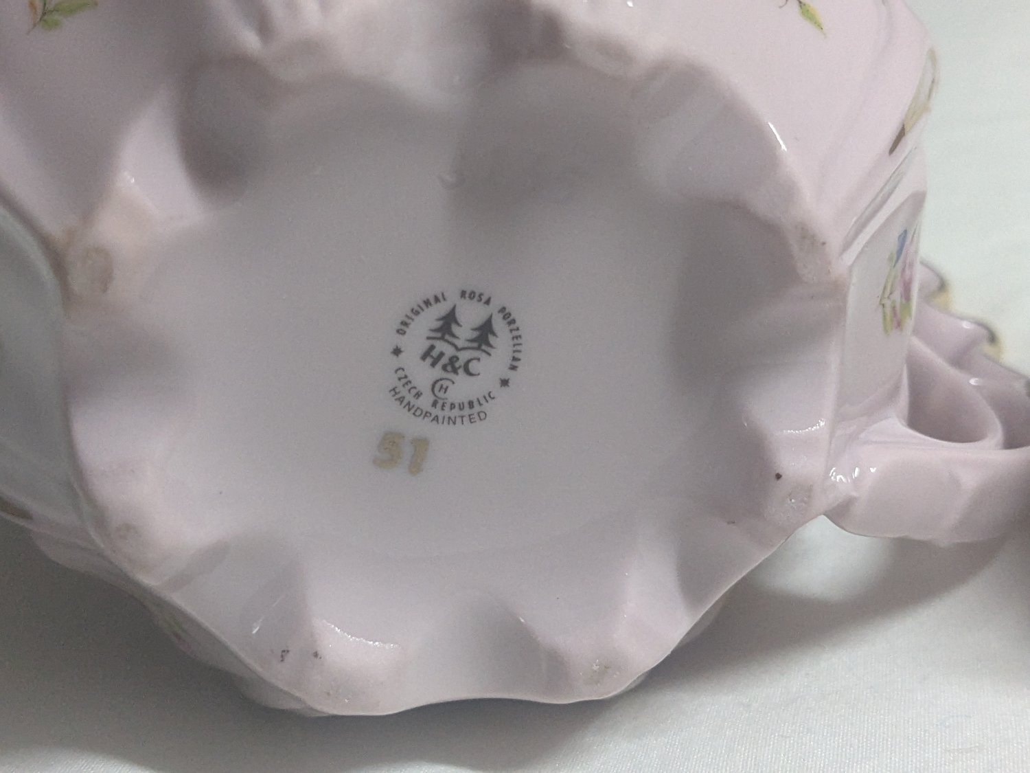 This pair of original Rosa Porzellan (pink porcelain) mugs are absolutely beautiful and have never been used. They were kept in the box, which definitely shows it age :). They have lovely 24Kt gold trim on the handles and on the design as well being decorated by hand with 8 different types of flowers around the bottom. They were made by H&C porcelain factory, Czech Republic and the marking on the bottom was used from 1991 to 2003. These mugs are are in excellent vintage condition and would make a lovely Mother's Day gift.
