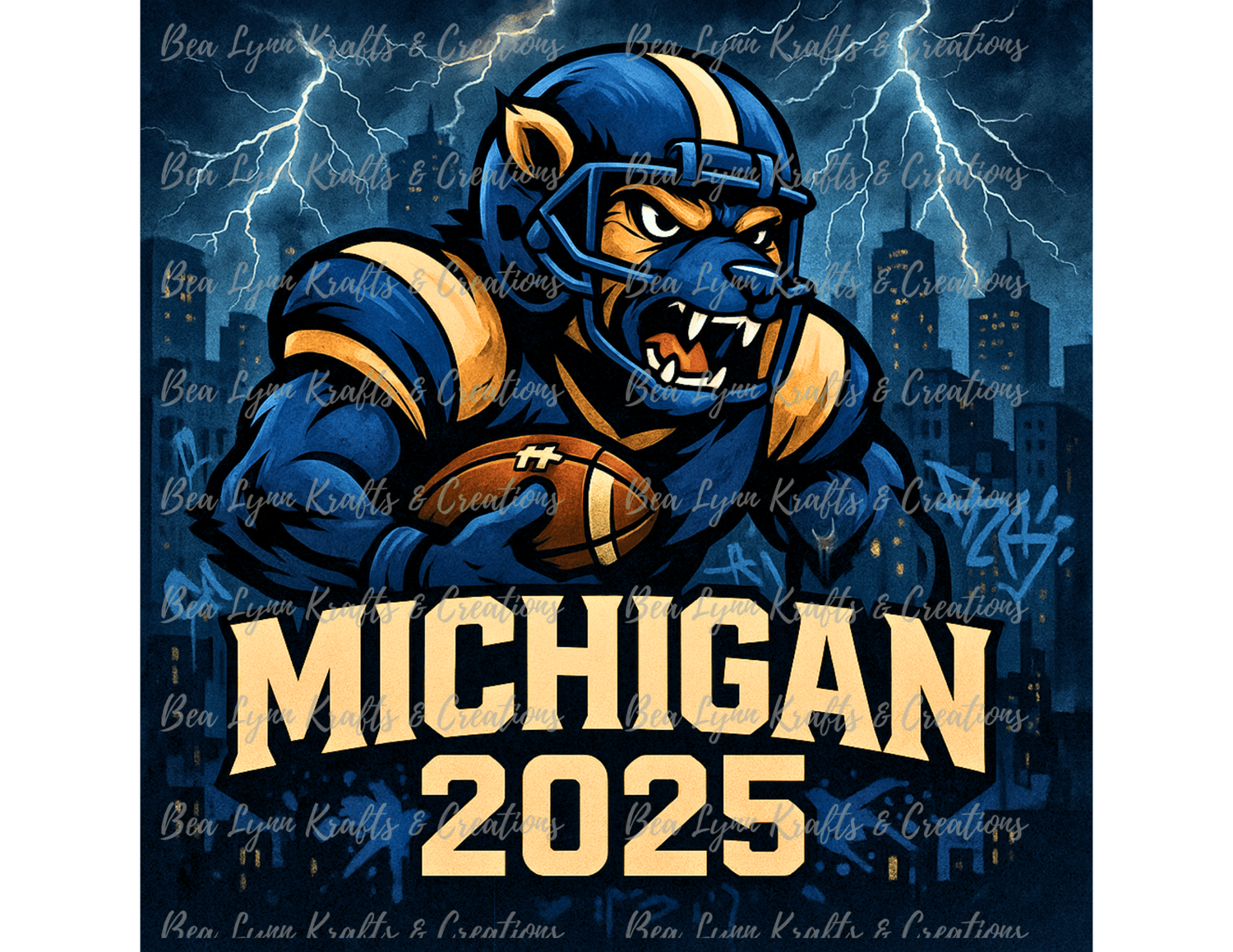 Wolverine Nation — the growl is louder, the lightning is closer, and Michigan is ready to turn 2025 into a season of pure domination! This dynamic transparent PNG features a ferocious, full-throttle Wolverine charging through a city storm, football in hand, repping maize and blue like a true legend. The urban skyline, electric bolts, and graffiti backdrop? Just fuel for that next-level Wolverine energy.