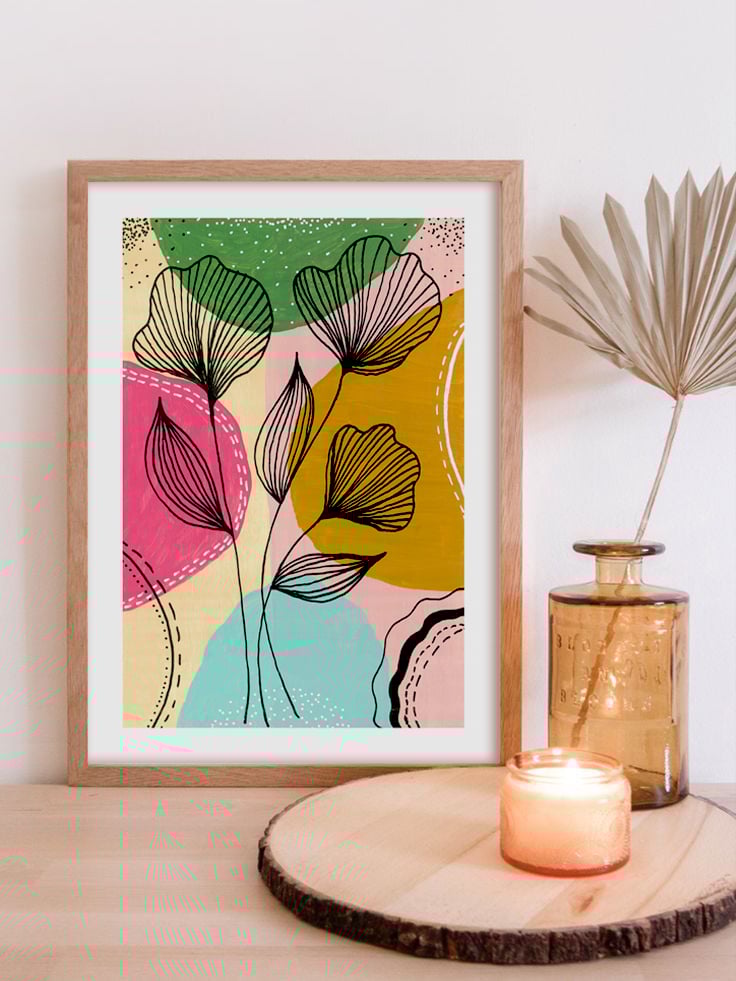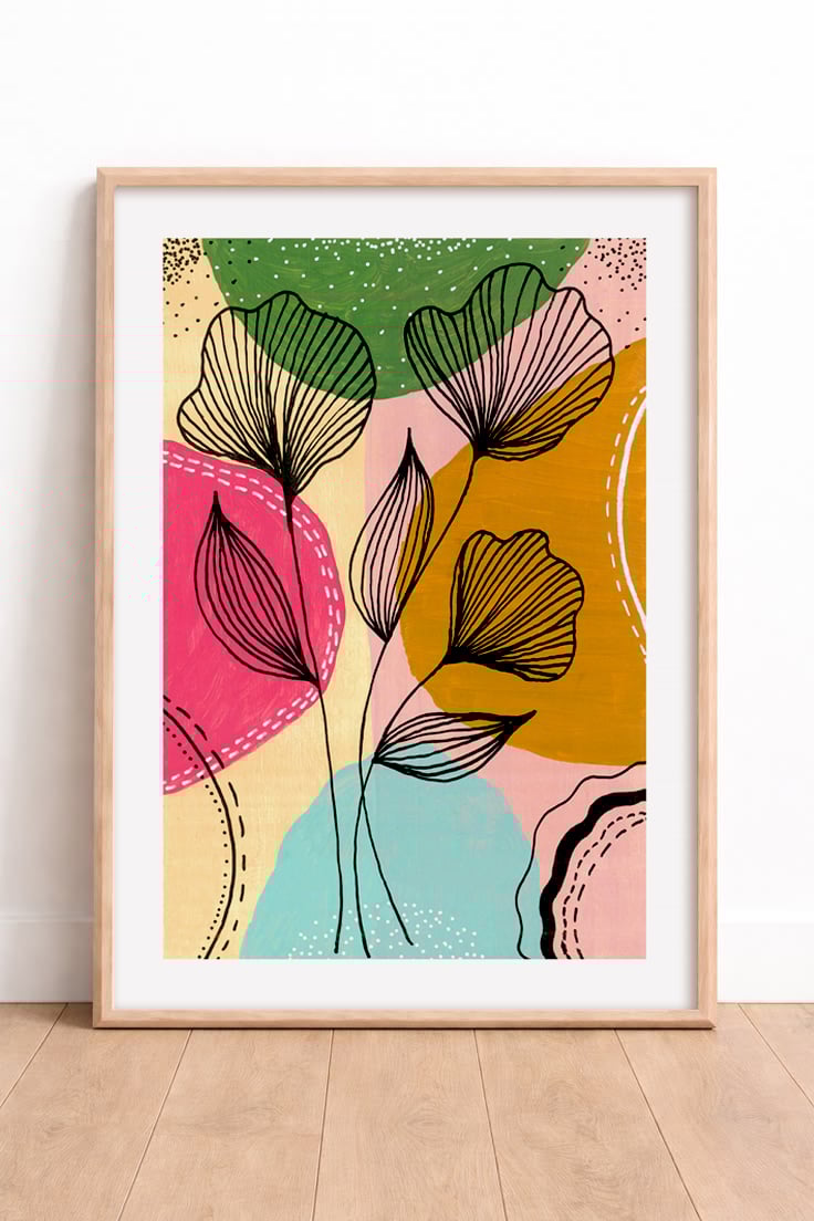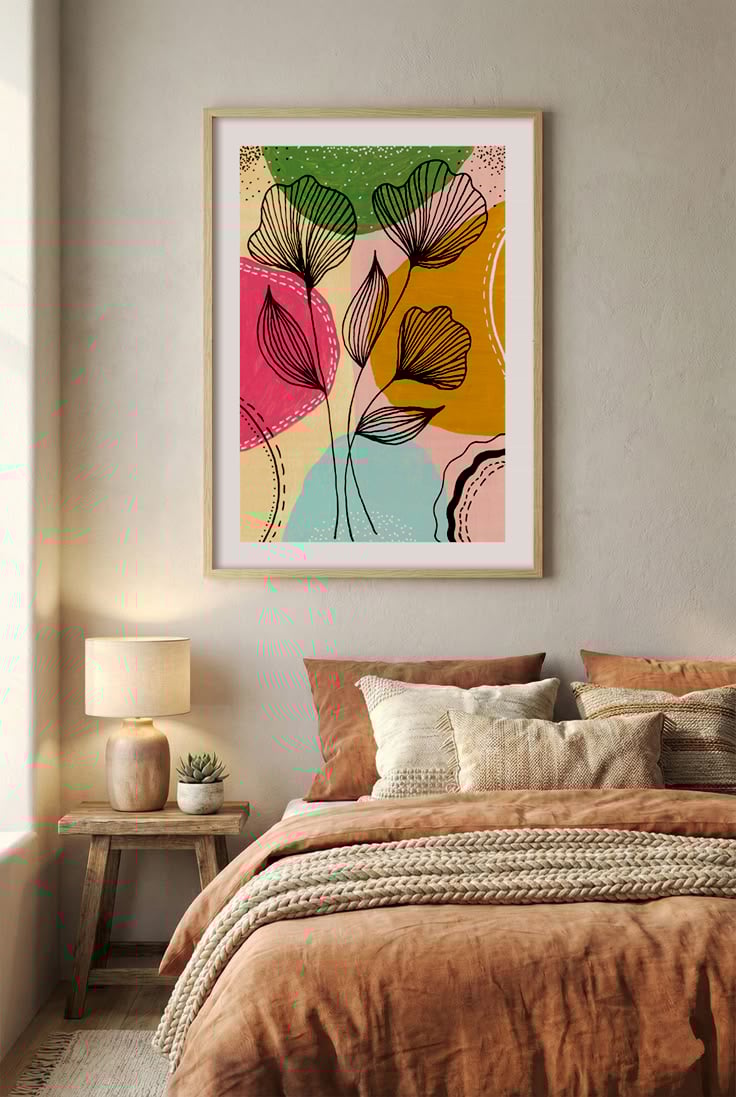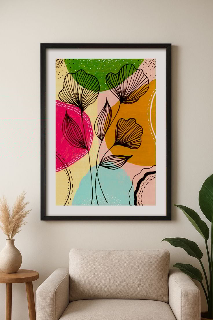 Elevate your space instantly with this Abstract Botanical Line Art printable. Featuring hand-drawn floral silhouettes layered over vibrant, organic shapes in a palette of terracotta, teal, and blush pink, this piece perfectly bridges the gap between Mid-Century Modern and Contemporary Boho styles.