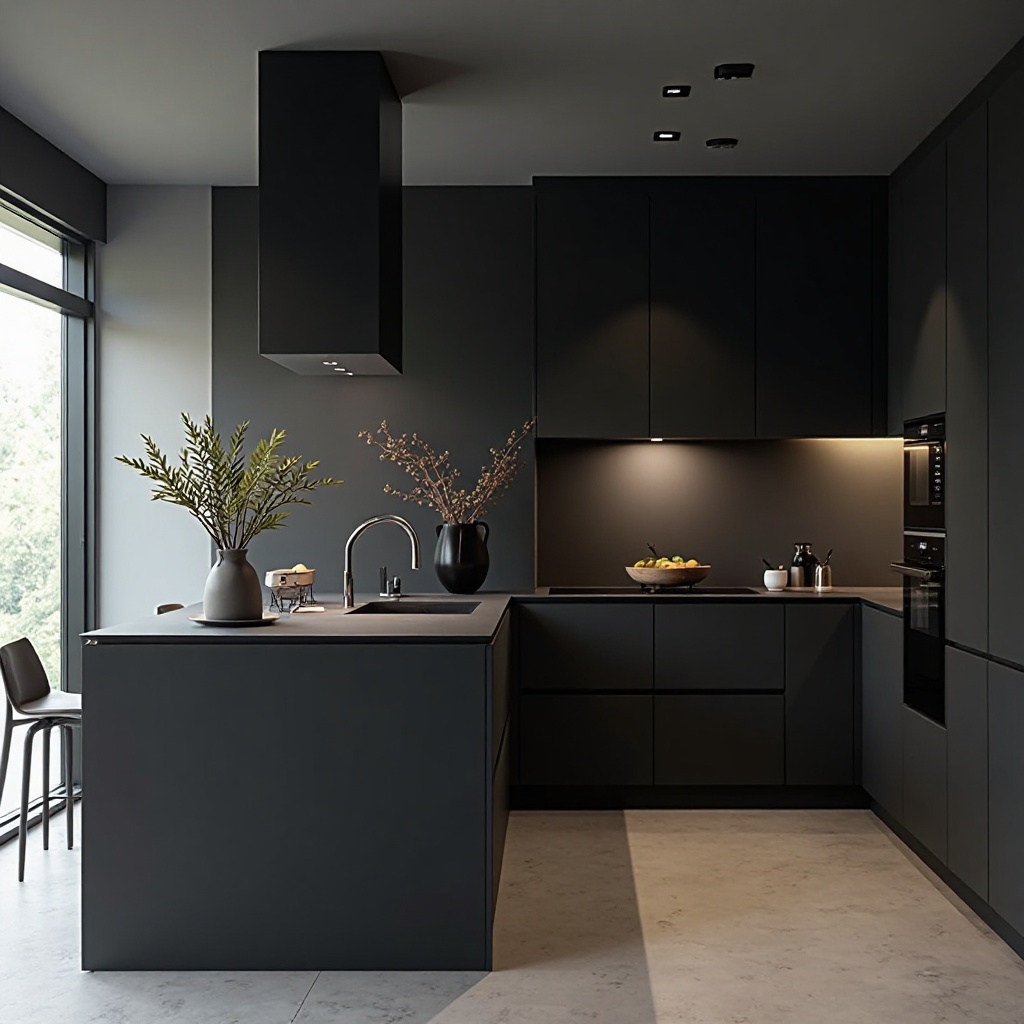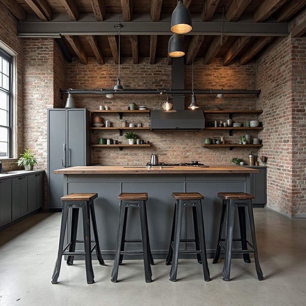 The exposed brick walls bring warmth and texture, creating a powerful contrast against the dark cabinetry and matte black metal accents. The natural imperfections of brick and wood add realism and depth, giving your artwork a grounded, high-end presentation.