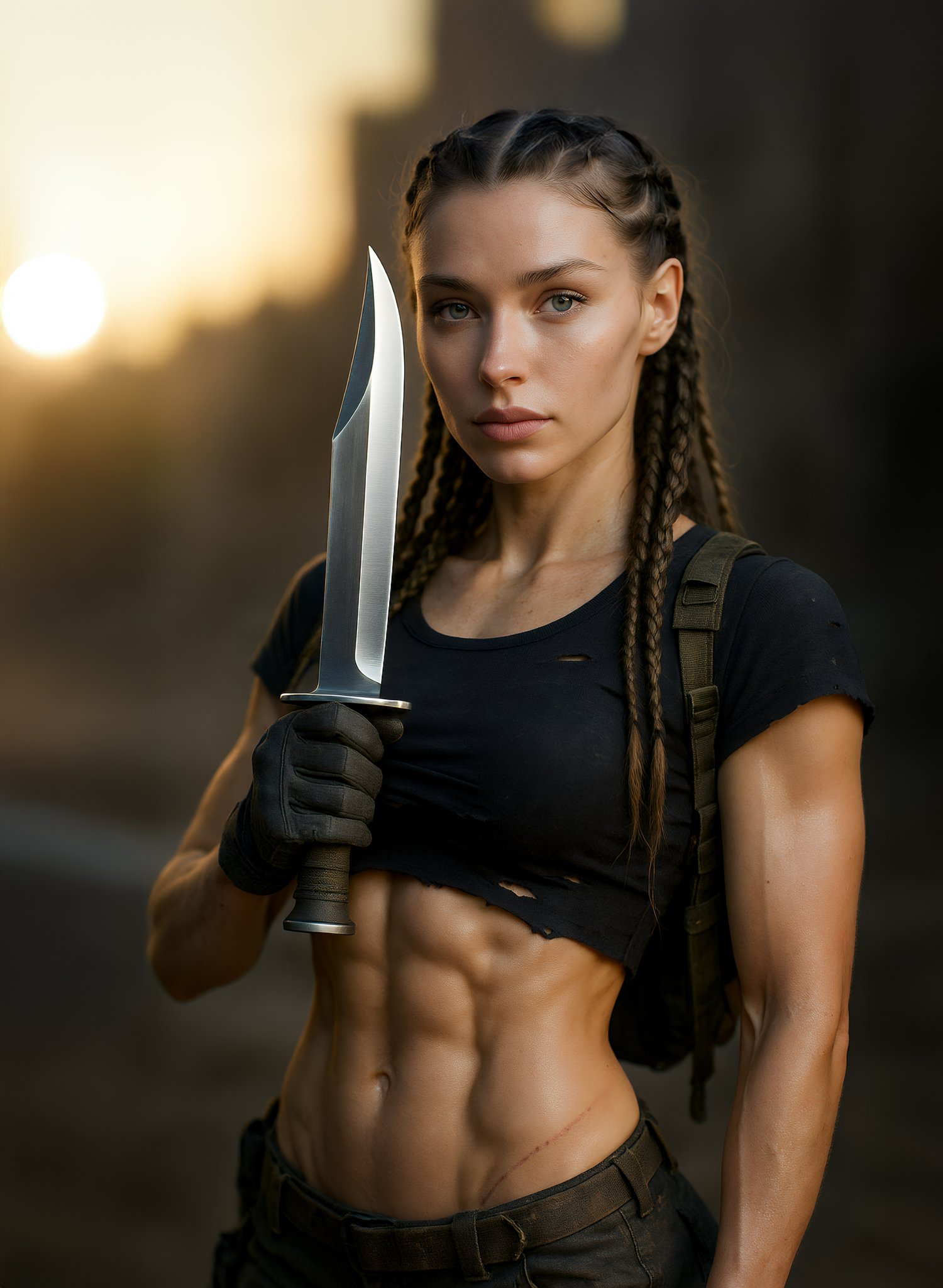 This premium collection contains 100 ultra-detailed 8K cinematic frames, designed as a cohesive visual set with a unified atmosphere, style, and color grade. The images showcase a post-apocalyptic female warrior captured in multiple environments, lighting scenarios, and emotional states.