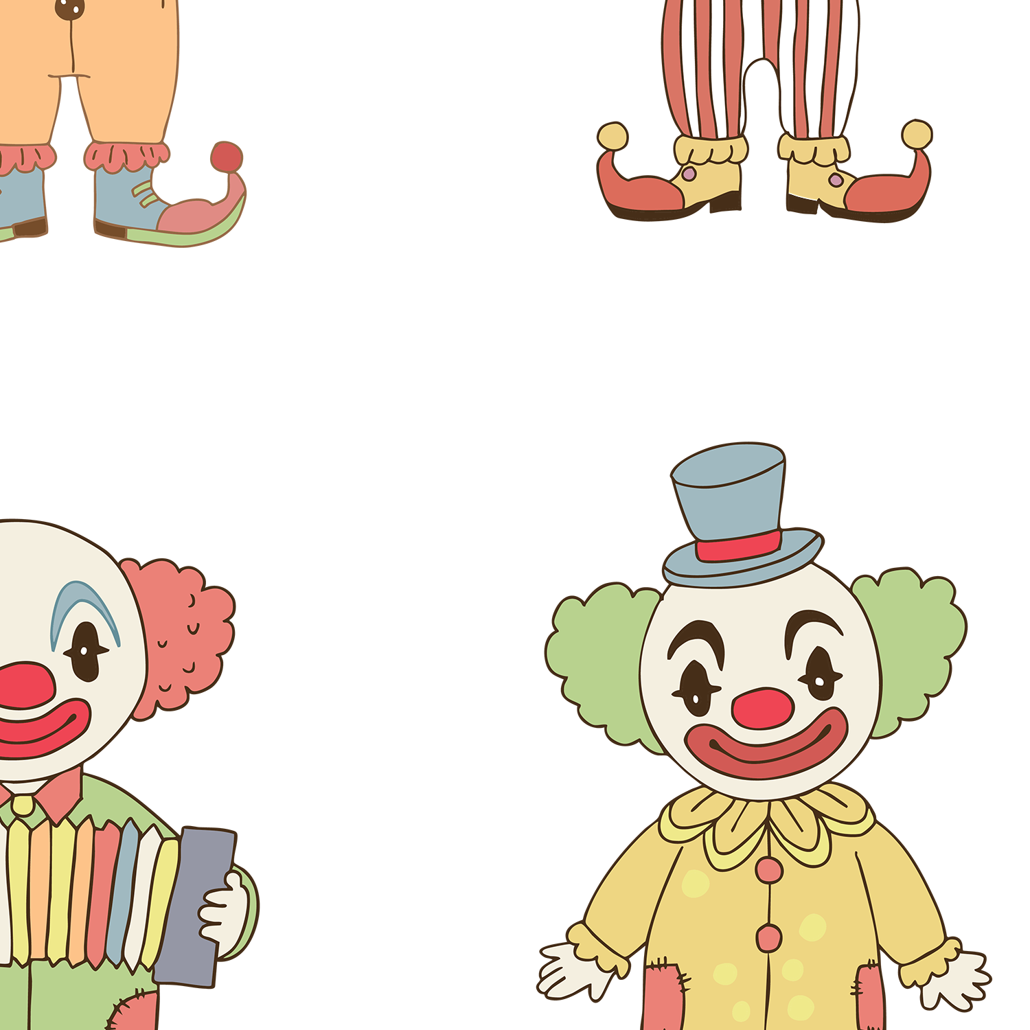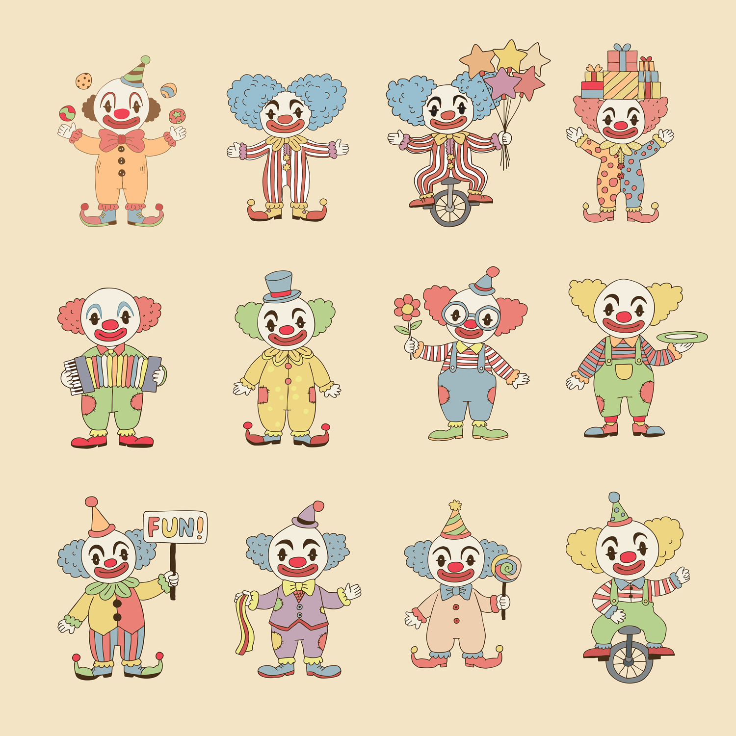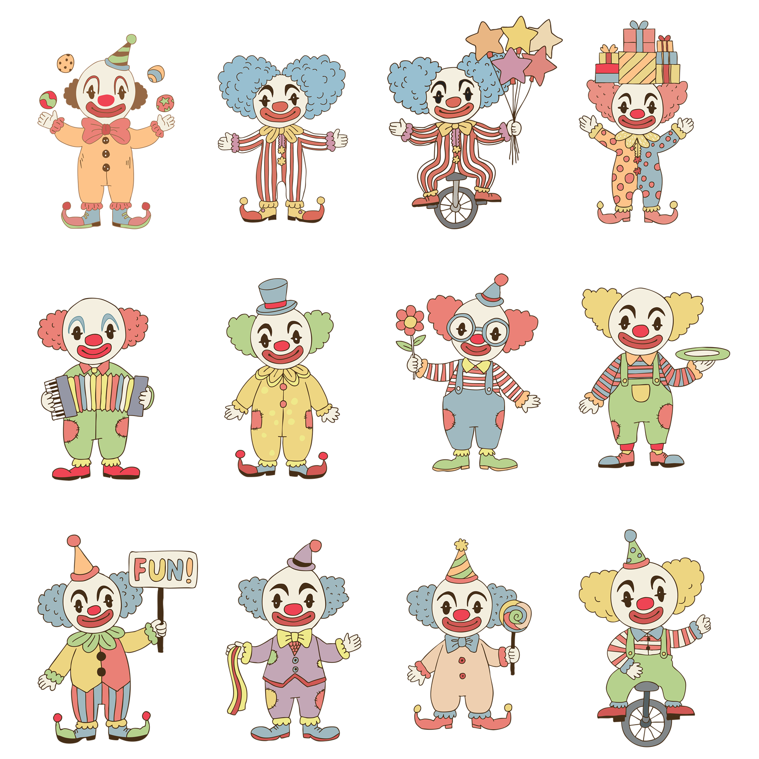 Hand-drawn Clown Line Art Clipart Set – Colored PNG & SVG | 12 Illustrations