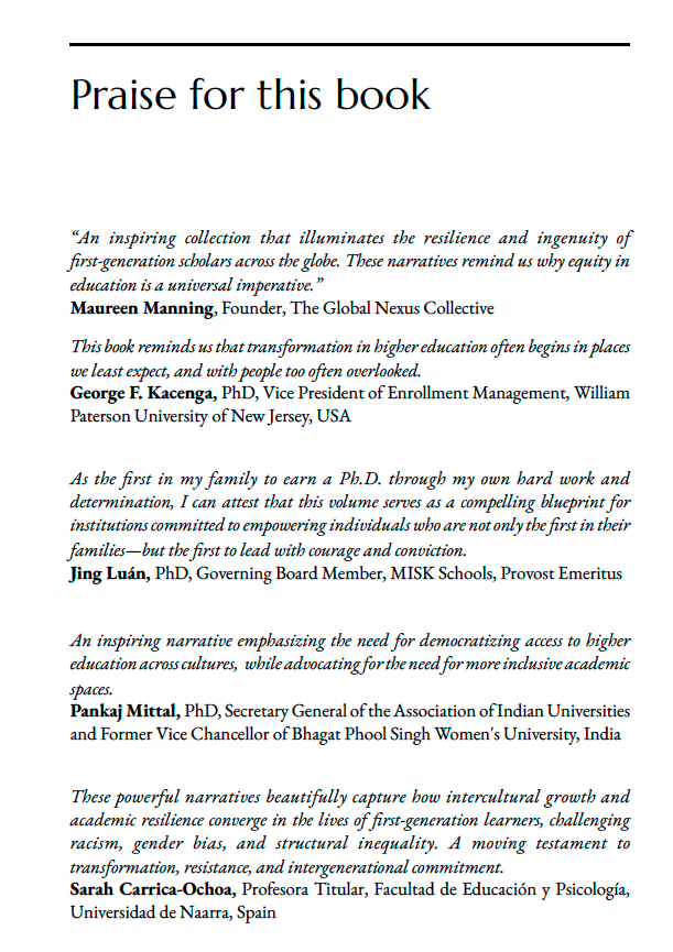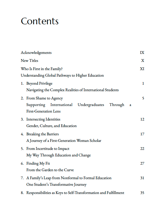 First in the Family brings together powerful narratives of first-generation students who have crossed borders—geographical, cultural, and social—to pursue higher education. Spanning continents and diverse experiences, the chapters explore themes of identity, gender, resilience, and belonging. From navigating privilege and overcoming shame to embracing agency and transforming lives through education, these stories reveal both the struggles and triumphs of being “first.” Each chapter offers a testament to courage, perseverance, and the transformative power of learning to uplift families and communities. Inspiring and deeply human, this volume serves as a vital resource for students, educators, and policymakers committed to expanding access and equity in education worldwide.