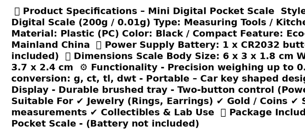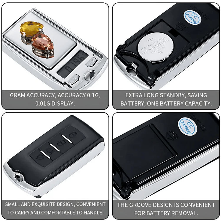 This ultra-compact digital pocket scale offers precise measurements up to 0.01g, ideal for weighing jewelry, gold, coins, or kitchen ingredients. Shaped like a car key and powered by a CR2032 battery, itβs portable, stylish, and reliable β perfect for everyday use at home or on the go.