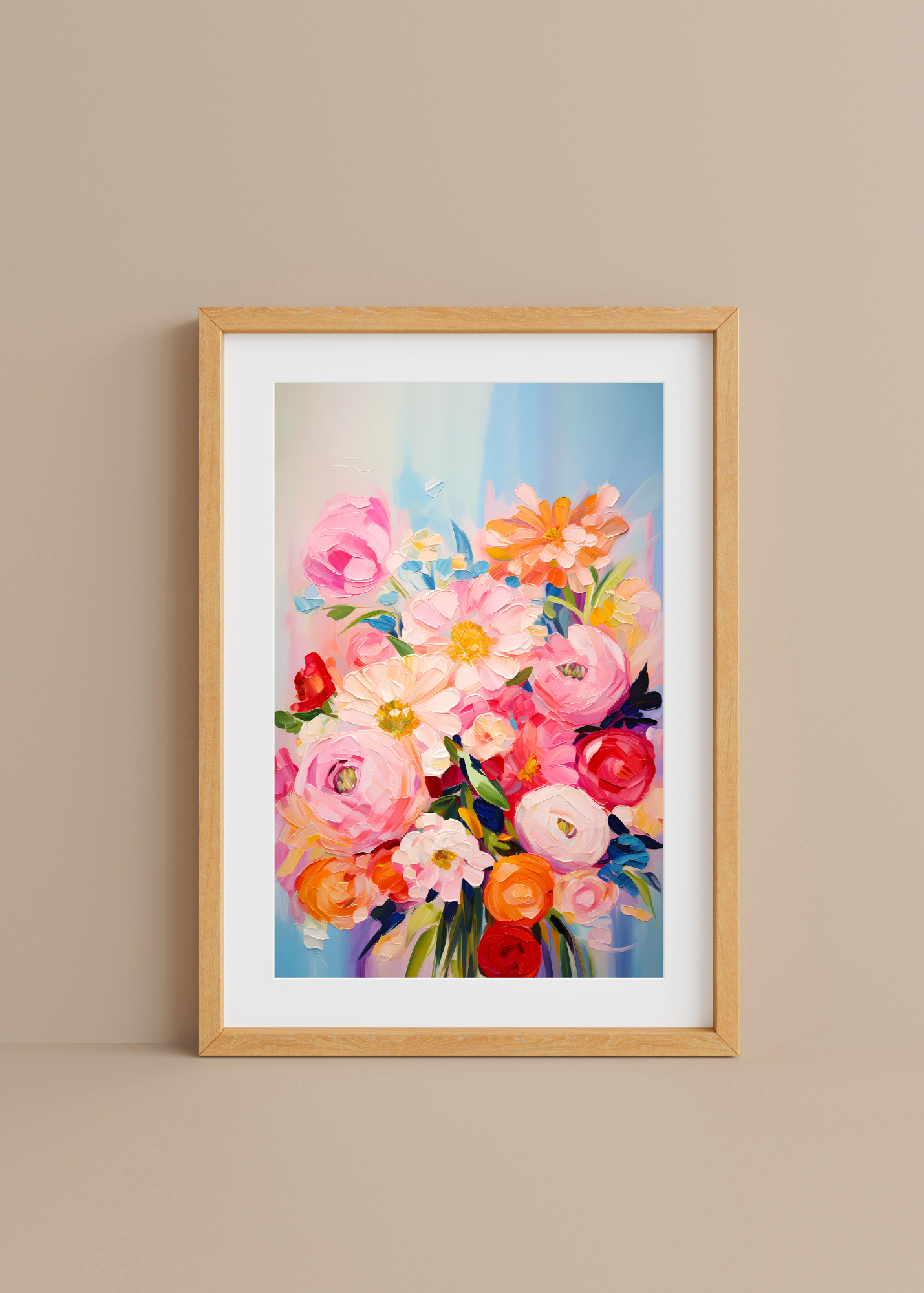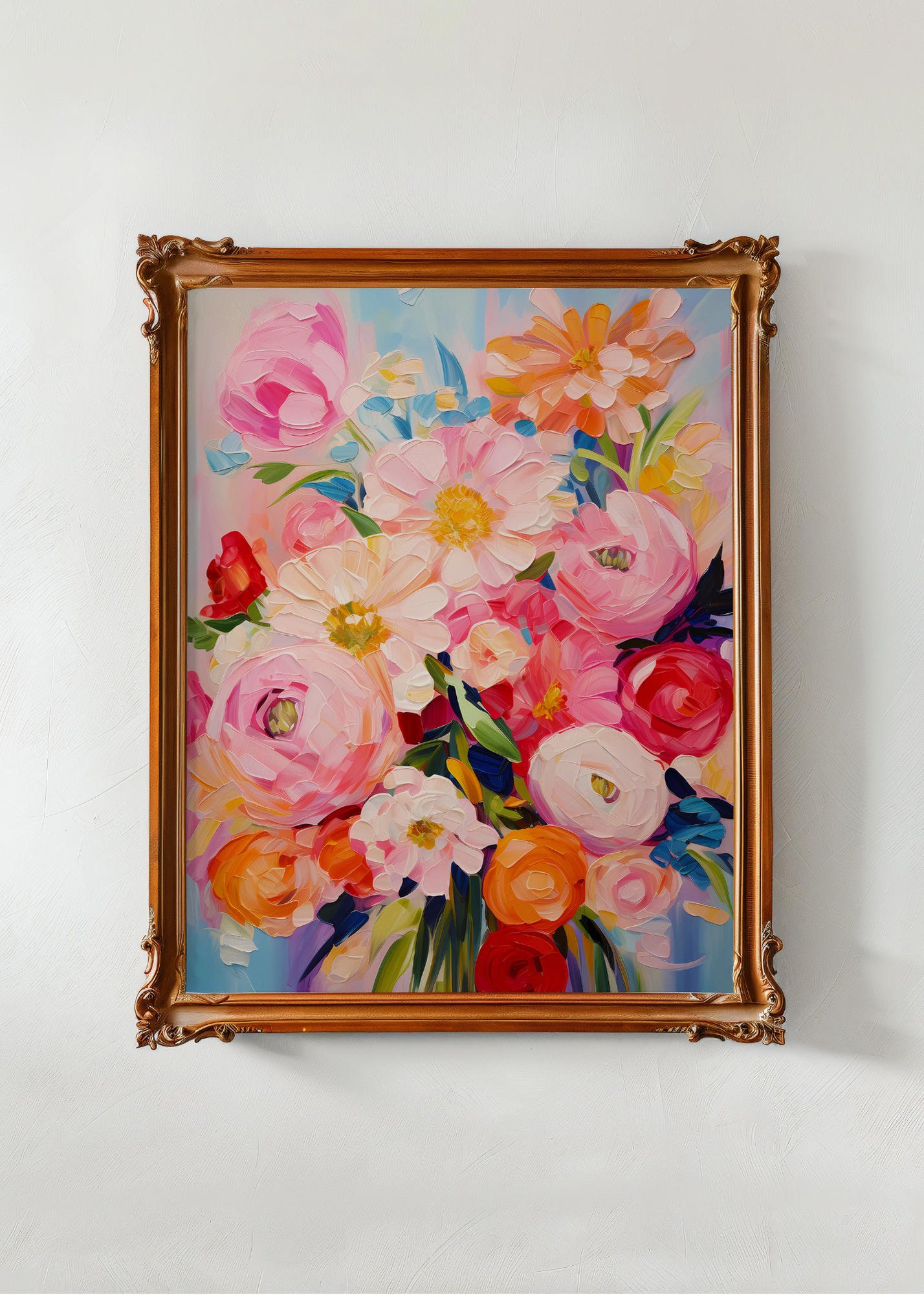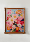 Sunspill— Bathed in golden light, this vibrant bouquet dances against a sky blue backdrop. Bright poppies in coral, lavender, apricot, and soft cream rise like fireworks from a classic white vase. This print feels like the warmth of late afternoon sunlight pouring through a window—alive, radiant, and full of warmth.