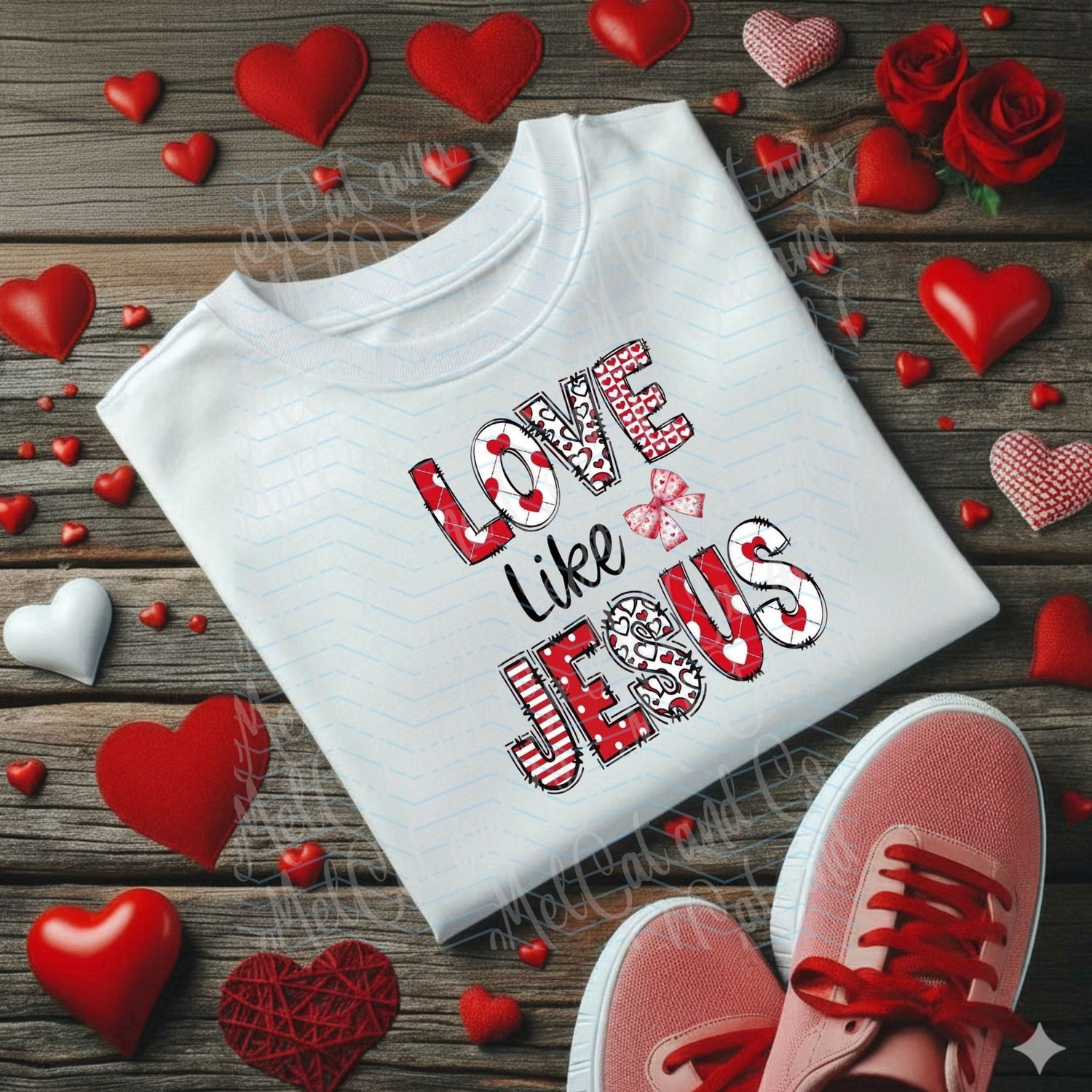 Share a powerful message of faith and love with this beautiful “Love Like Jesus” Christian Valentine digital design. Featuring bold, playful lettering filled with red, white, and heart-patterned textures, this design is accented with a sweet bow for a warm, uplifting Valentine vibe.