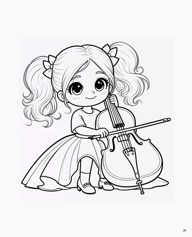 Розмальовка «Грай, музика, грай» — це 30 сторінок веселого музичного світу, де звірята та діти співають, танцюють і грають на інструментах. Малята познайомляться з гітарами, барабанами, піаніно, флейтами та навіть чарівними скрипками.