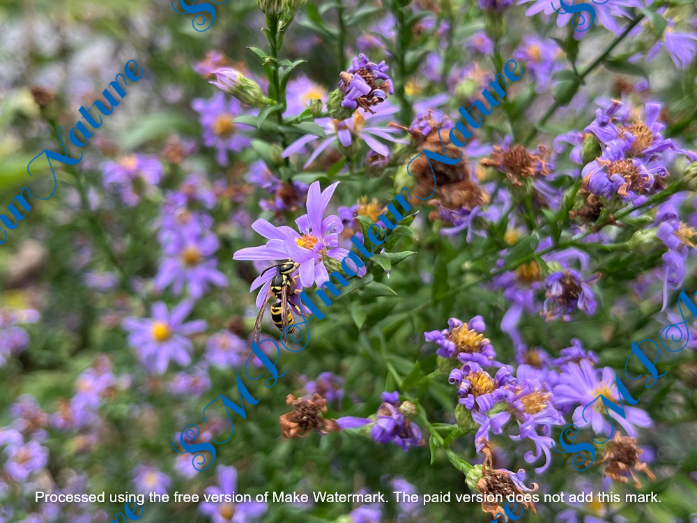 Amateur photograph of an Eastern Yellowjacket (Vespula maculifrons) feeding on American aster flowers. Image taken in Virginia, USA. Image pixels 3024x4032. Image easily resized as required for buyer needs. Purchase gives image without any watermark.