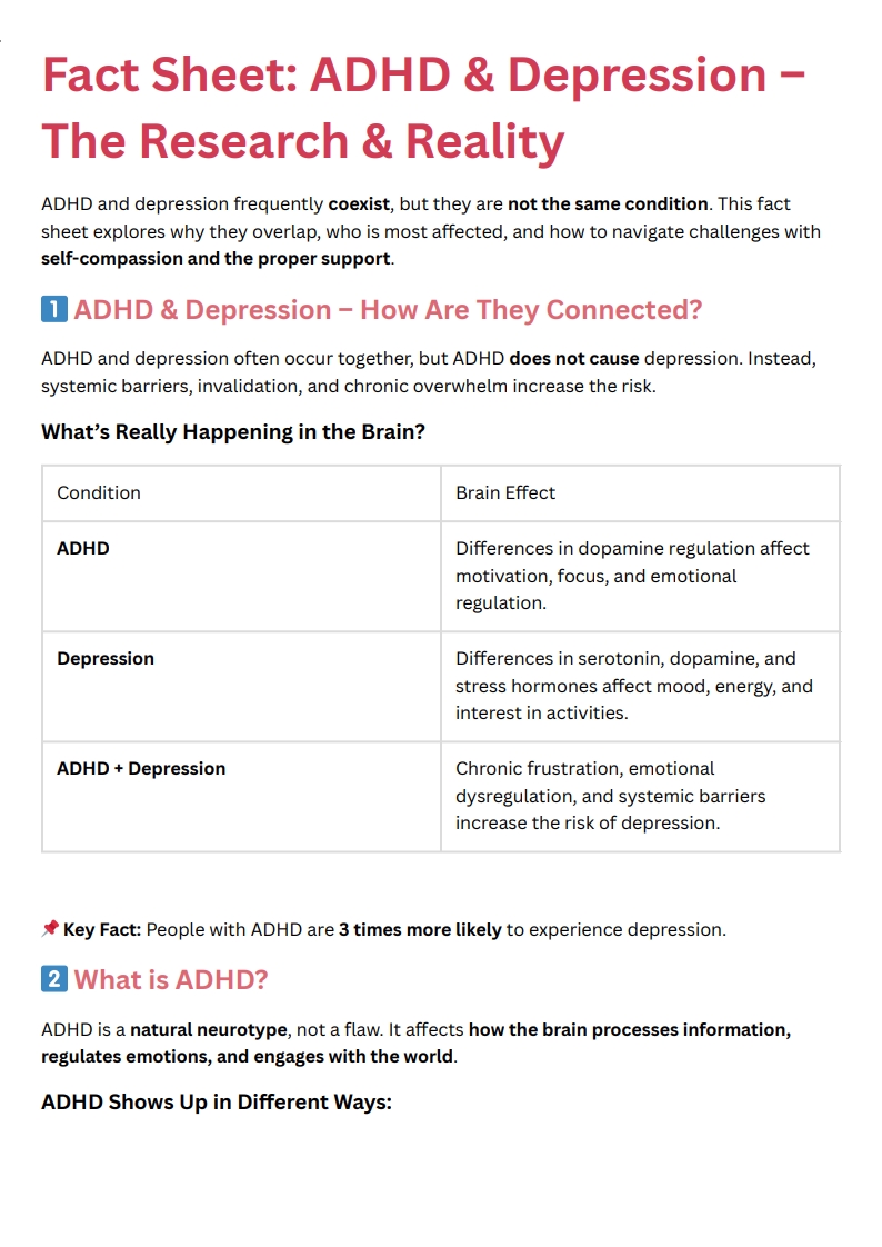 ADHD and depression frequently co-occur, but ADHD does not cause depression. Instead, systemic barriers, emotional exhaustion, and chronic stress contribute to increased depression risk. Research shows that people with ADHD are 2.7 to 3 times more likely to experience major depressive disorder.