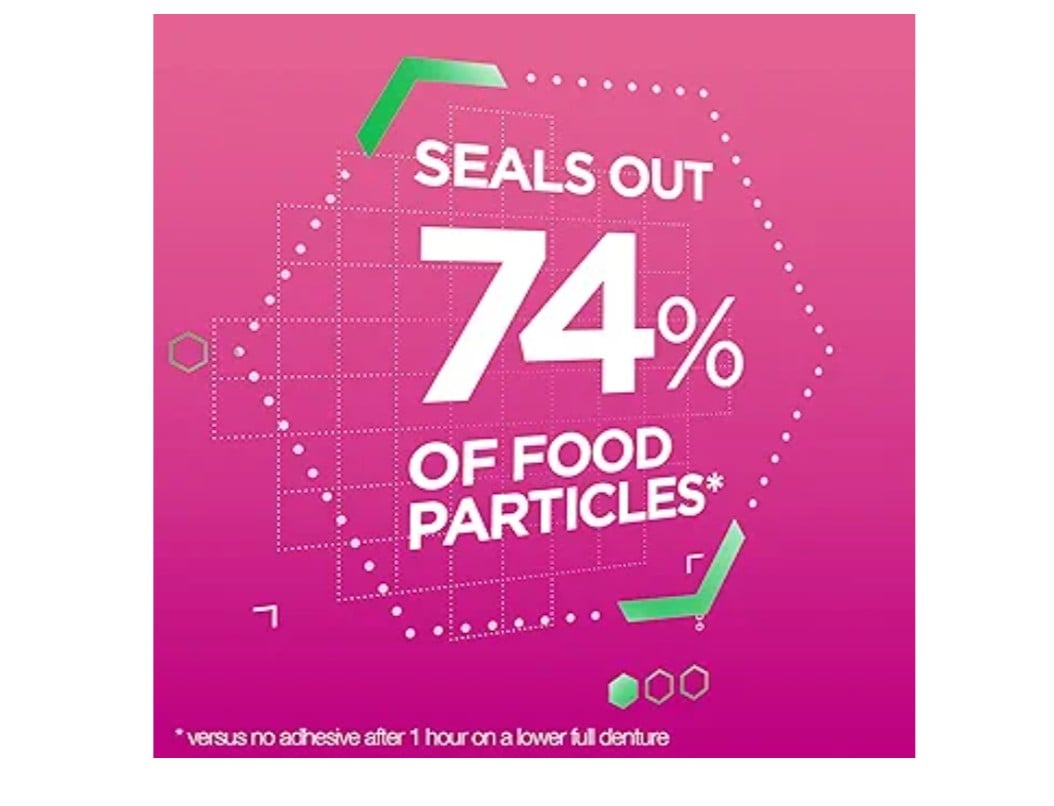 Super Poligrip denture products seal out food particles to prevent gum irritation