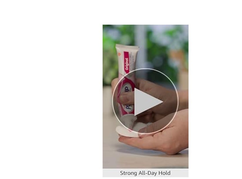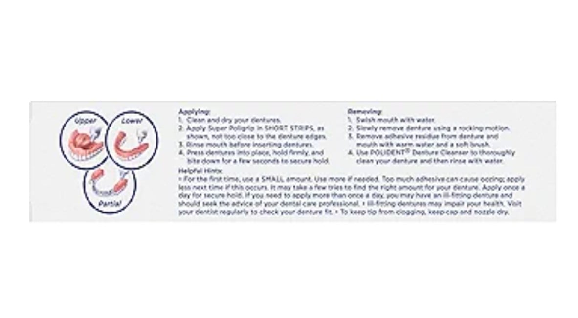 Applying: 1. Clean and dry your dentures. 2. Apply Super Poligrip in SHORT STRIPS, as shown, not too close to the denture edges. 3. Rinse mouth before inserting dentures. 4. Press dentures into place, hold firmly, and bite down for a few seconds to secure hold. Removing: 1. Swish mouth with water. 2. Slowly remove denture using a rocking motion. 3. Remove adhesive residue from denture and mouth with warm water and a soft brush. 4. Use POLIDENT Denture Cleanser to thoroughly clean your denture and then rinse with water. Helpful Hints: For the first time, use a SMALL amount. Use more if needed. Too much adhesive can cause oozing; apply less next time if this occurs. It may take a few tries to find the right amount for your denture. Apply once a day for secure hold. If you need to apply more than once a day, you may have an ill-fitting denture and should seek the advice of your dental care professional. Ill-fitting dentures may impair your health. Visit your dentist regularly to check your denture fit. To keep tip from clogging, keep cap a