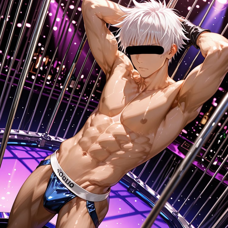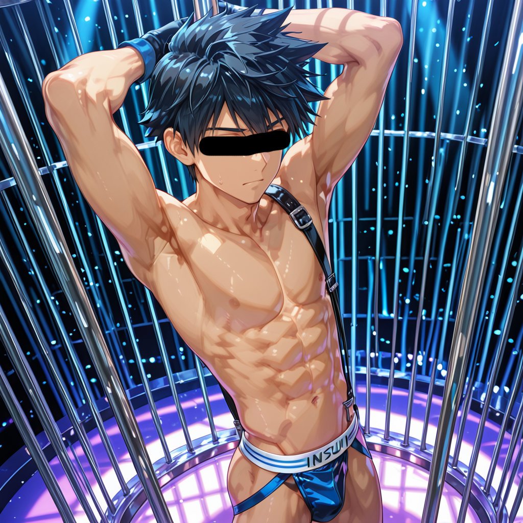 男性ショーダンサーをテーマに、ジョックストラップとサスペンダーを着せて、ポールと鳥かごをテーマに、キャラクターの魅力を存分に表現しました。