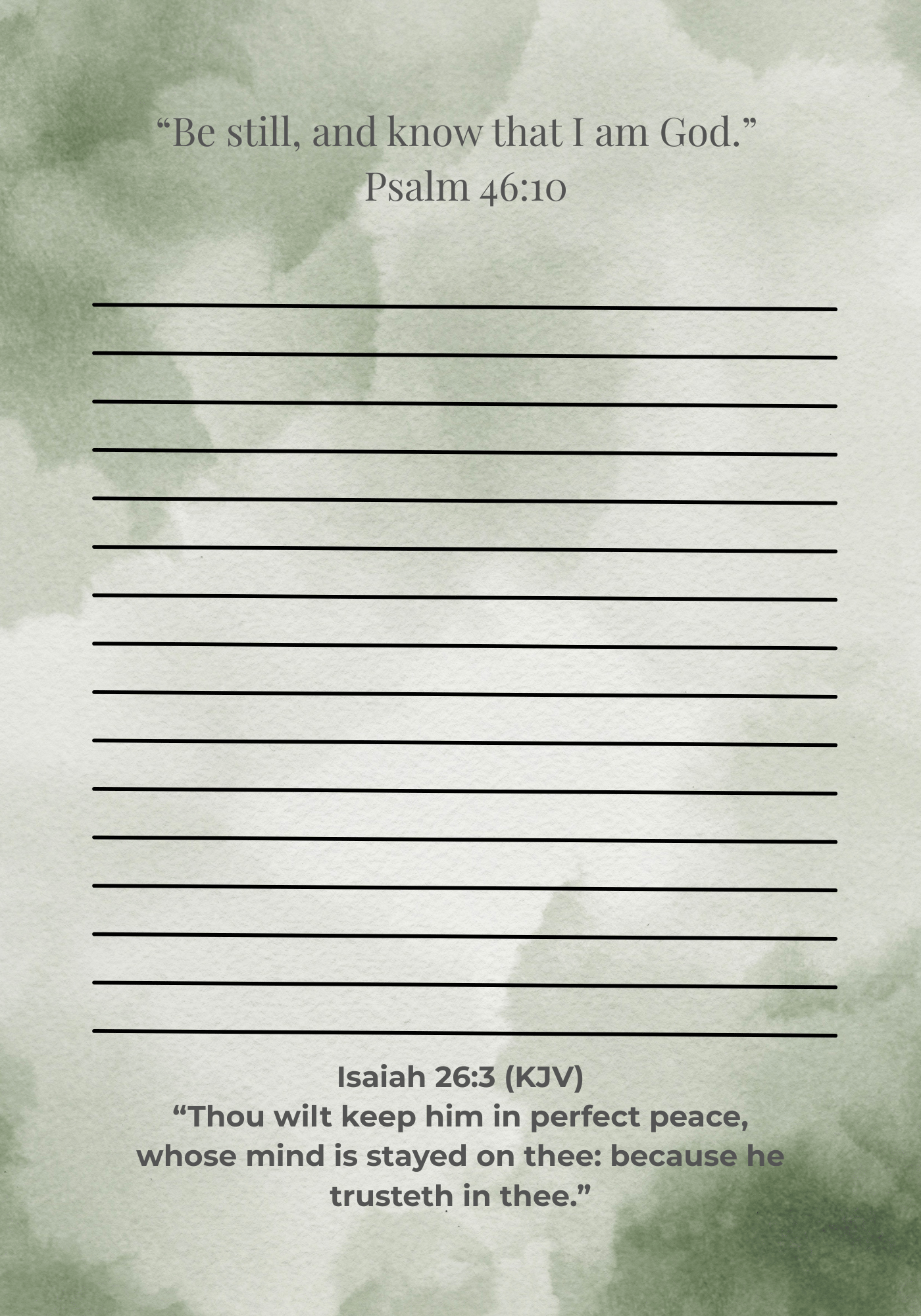 Each page features a carefully selected scripture with lined space for reflection, prayer, and journaling. Designed in soft sage, cream, and beige tones, this notebook brings calm, clarity, and sacred stillness to your quiet time.