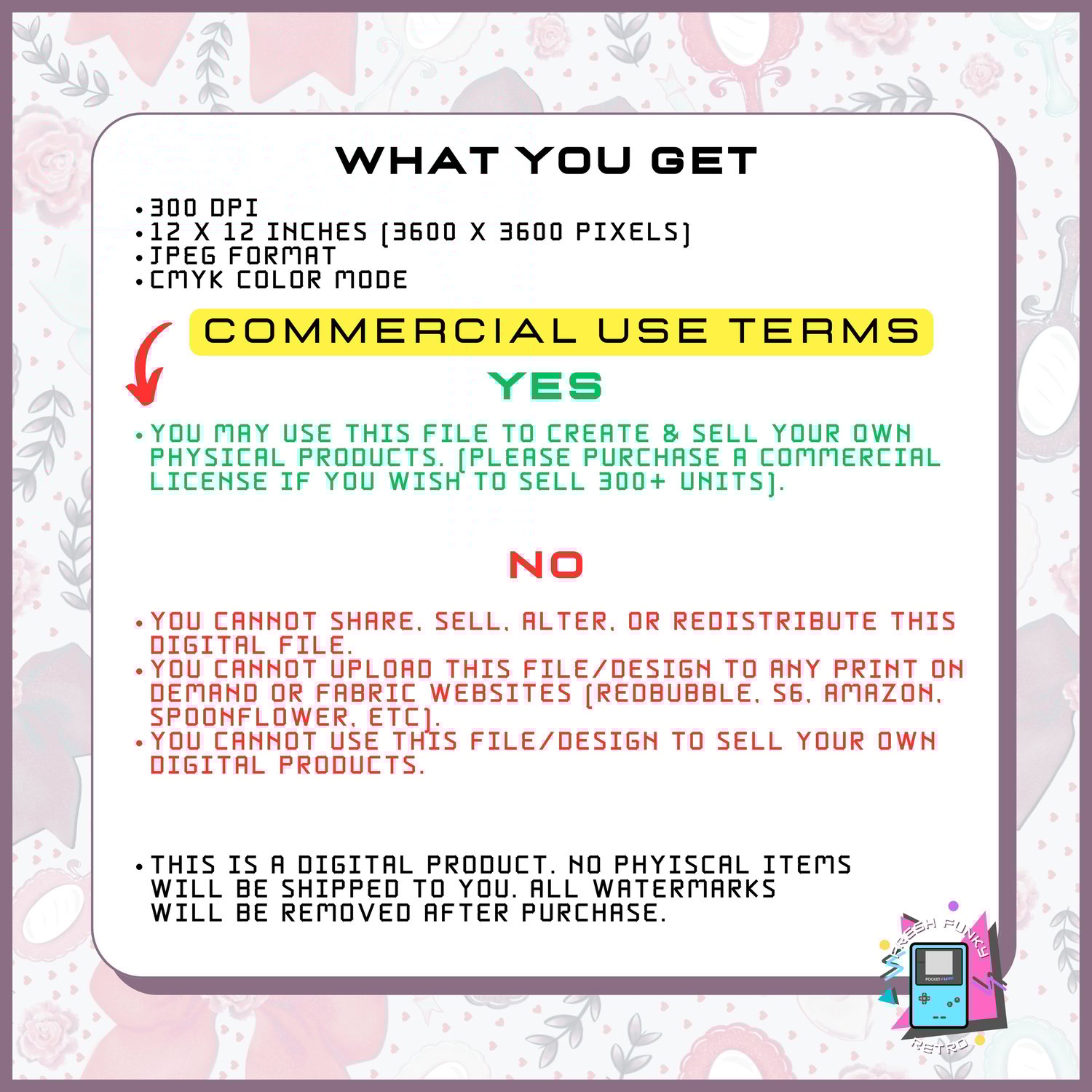- You cannot upload this file/design to any print on demand or fabric websites (Redbubble, S6, Amazon, Spoonflower, etc).