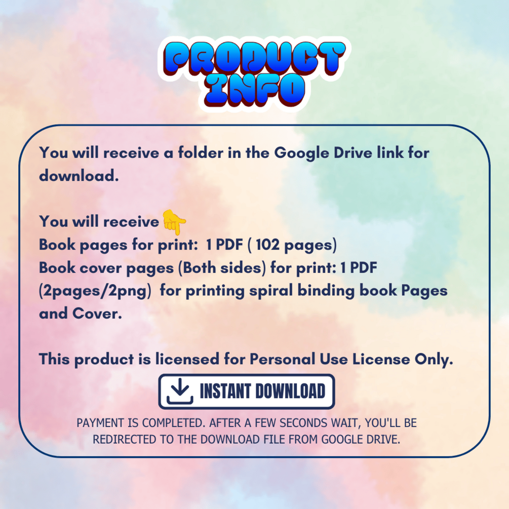 - Provided: You will receive, book pages for print: 1 PDF ( 102 pages) And book cover pages (Both sides) for print: 1 PDF (2pages/2png) for printing spiral binding book pages and cover.