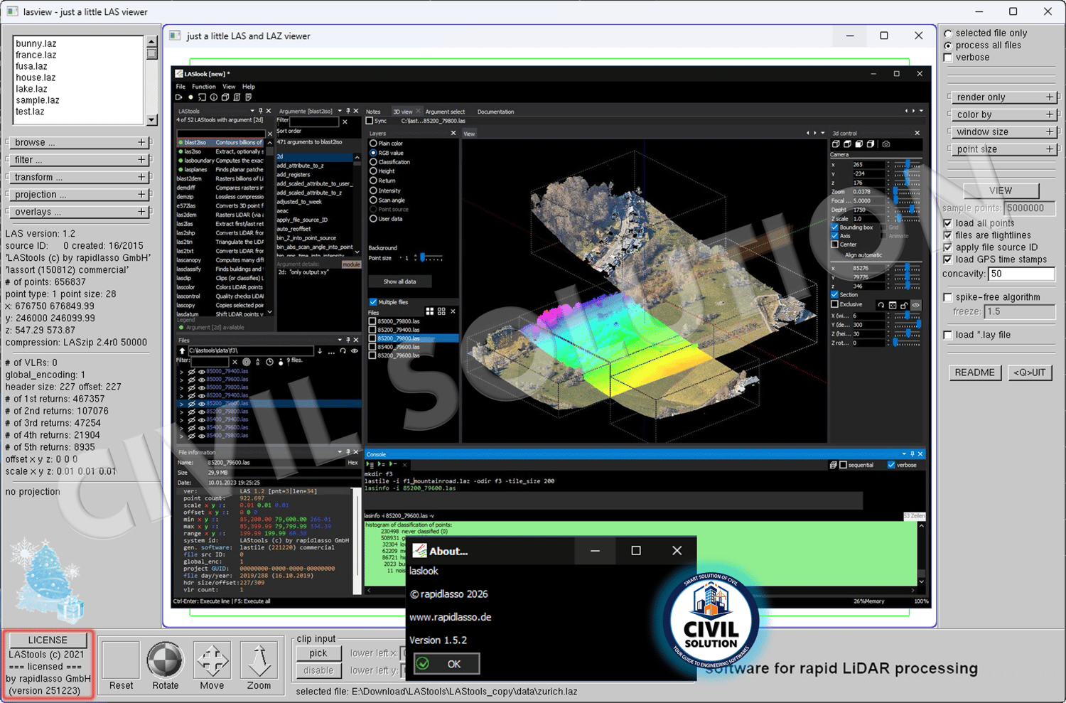 π rapidlasso LAStools Suite 2025 Build 2312 (Date: 12th Jan, 2026) is a powerful and industry-trusted LiDAR data processing and point-cloud management toolkit. It is widely used by surveyors, GIS professionals, and geospatial engineers for efficient handling, classification, conversion, and optimization of large-scale LAS/LAZ datasets.
