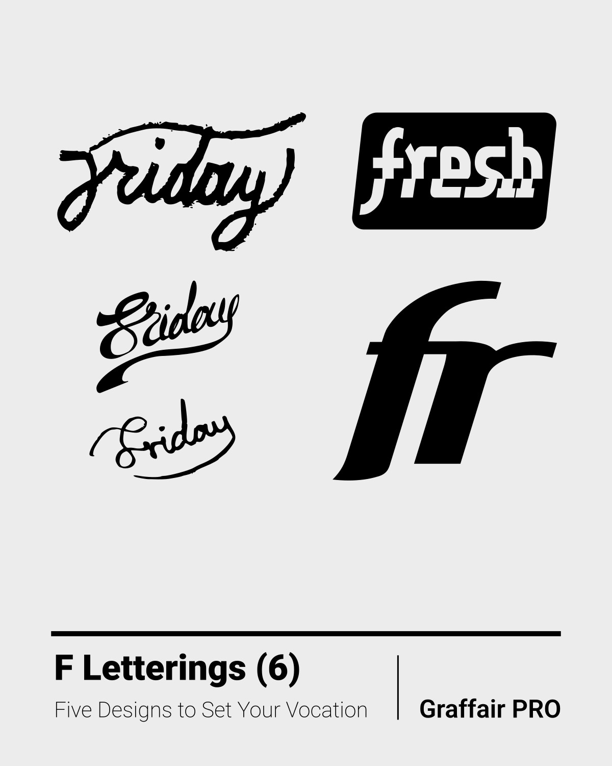 F Letterings (6): The 6th set of "F" logo/letterings includes five original designs. These letterings are part of the "800 SVG Letterings" bundle, which also contains 800 other exceptional designs.