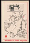 Advertising poster Pfaff sewing machines shows cherubs sewing clothes for the German Army in 1914. Poster in German. Liebesarbeit für unsere Feldgraven / F. Reiss.