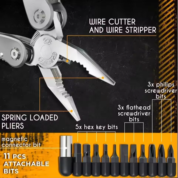 - 24 Functions in One Tool: Includes needle nose pliers, wire cutter, screwdrivers, knives, can/bottle opener, metal file, and 11 interchangeable bits.