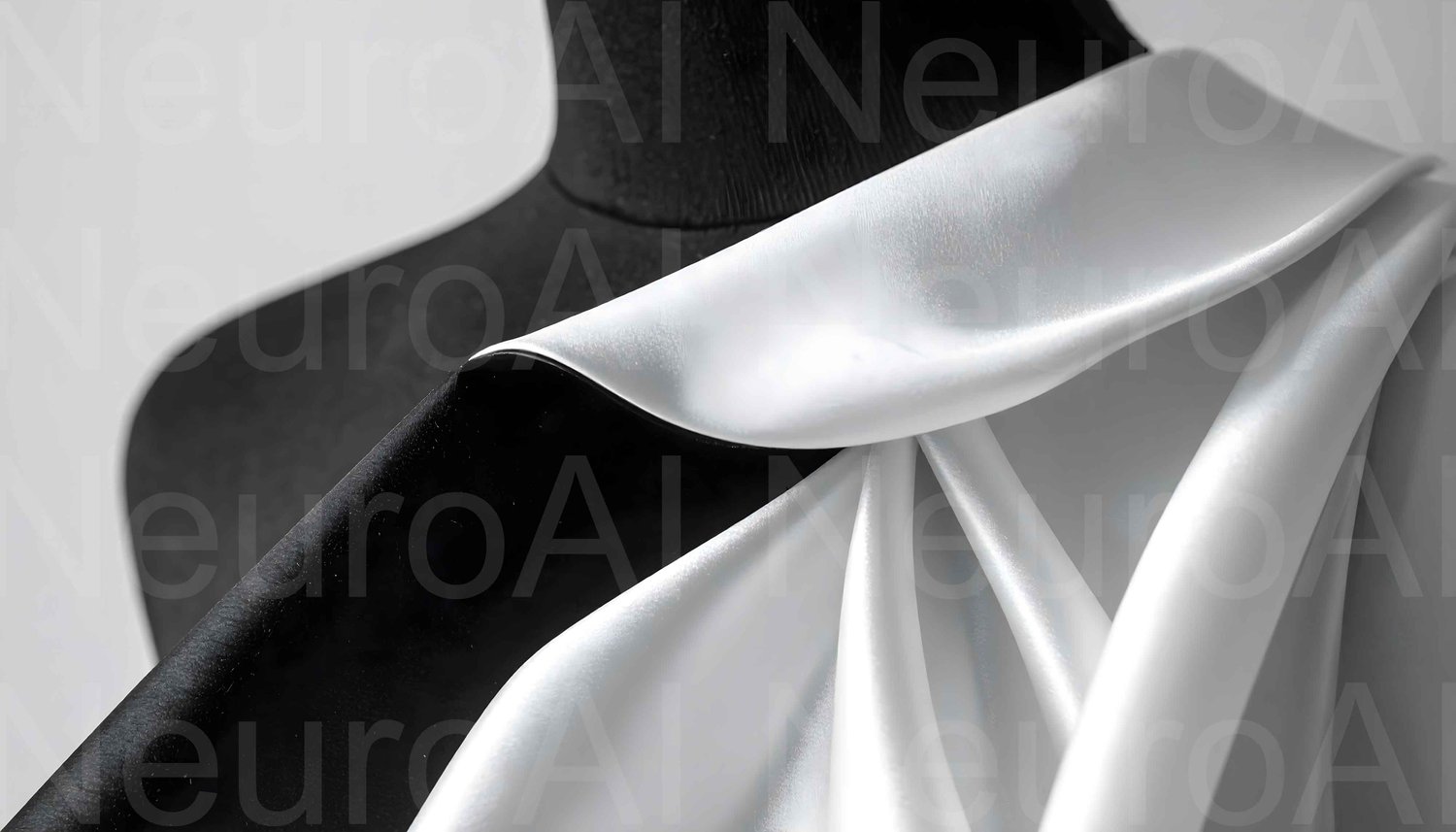 showcases the creative process of fashion design. A black mannequin is the focus, with smooth white fabric positioned and shaped, highlighting its texture and curves. The contrast between black and white and the soft lighting details create a professional, artistic, and sophisticated feel, making it perfect for projects related to fashion, design, or crafts.