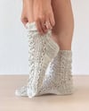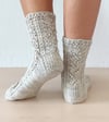 Konvalia Socks were created at the beginning of January, during that slightly longer winter days when all of the holiday fuzz is over and there’s more time for self care and indulgent knitting. It’s all about the process of slowly creating beautiful texture and making the flowers bloom on your socks - bell by bell, bobble by bobble. “Konvalia” is lily of the valley in Ukrainian, and along with being a stitch inspiration for this pattern it’s a lovely symbol of sweetness and return of happiness.