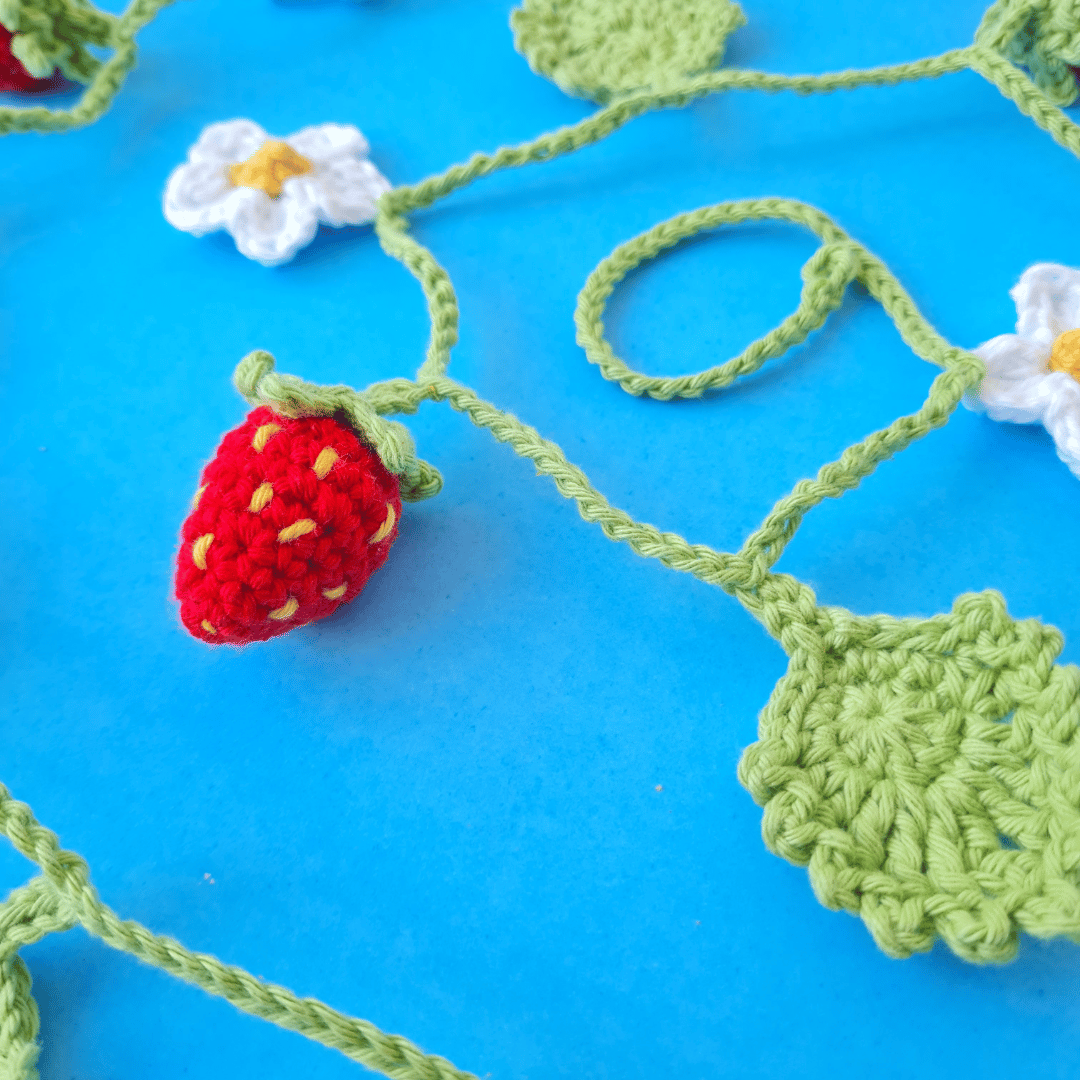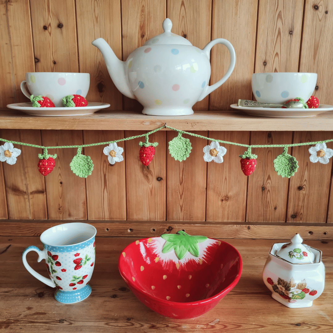 Add a touch of summer to your cottagecore home decor with this strawberry crochet garland pattern. Featuring pretty crochet strawberries, with delicate flowers and leaves, this crochet garland will look beautiful all summer long. Ideal for decorating a dresser or shelves, it adds a subtle pop of colour.