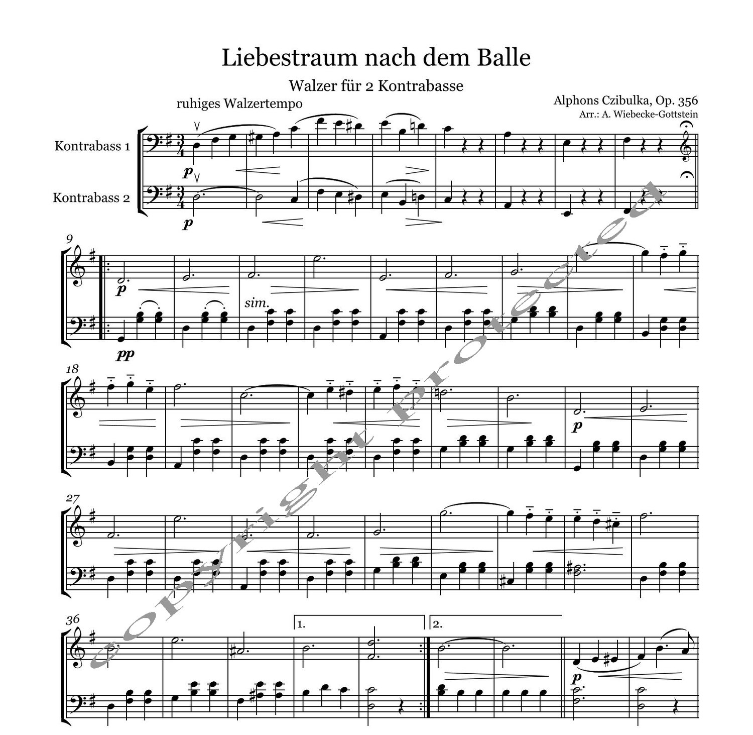 Viennese waltz. In this version, the second double bass plays the typical waltz accompaniment with double stops throughout, while the first double bass melodically revels in the high registers above it. (cf. order no. 202)