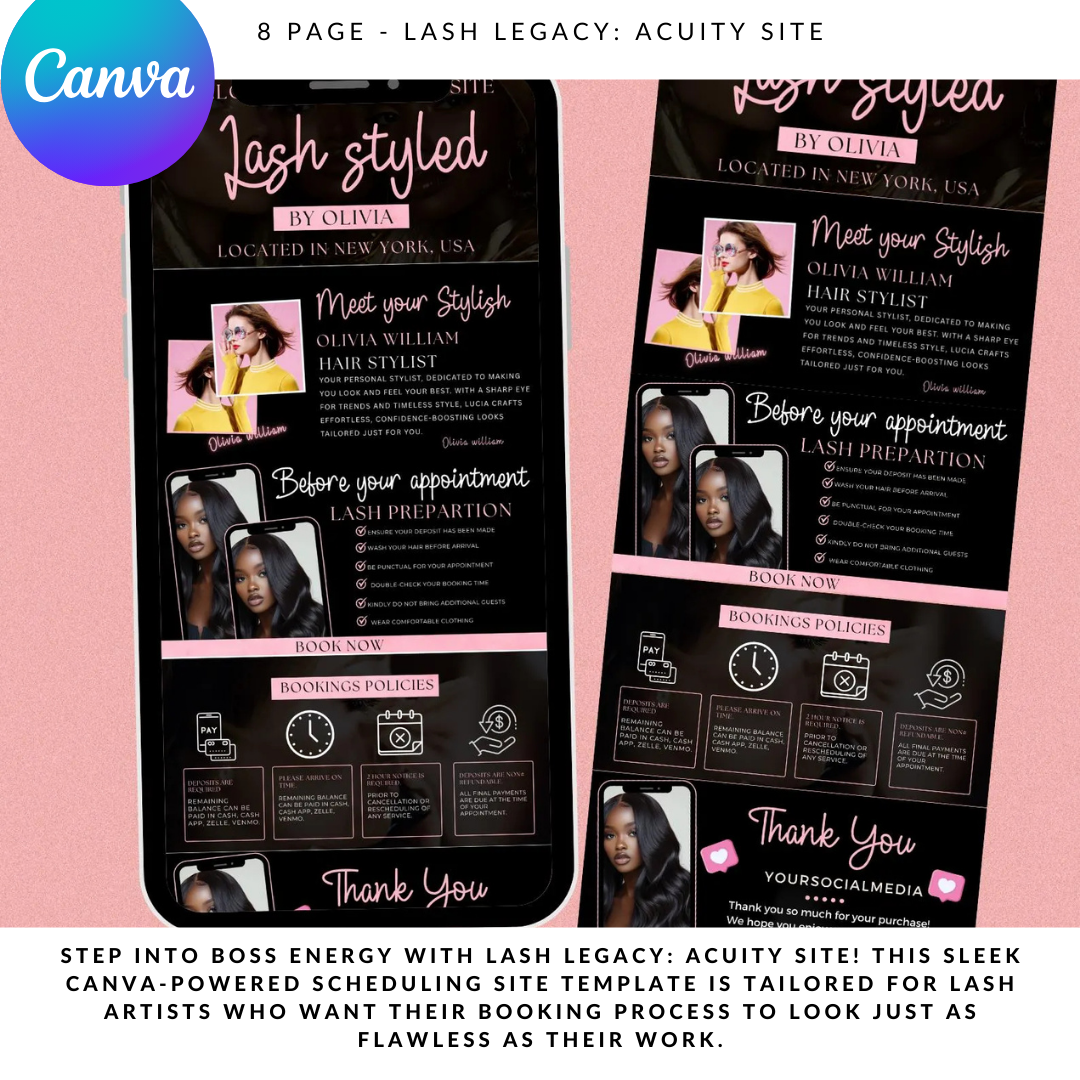 Step into boss energy with LASH LEGACY: Acuity Site! This sleek Canva-powered scheduling site template is tailored for lash artists who want their booking process to look just as flawless as their work. Perfectly polished, mobile-friendly, and designed to wow clients from the first click.