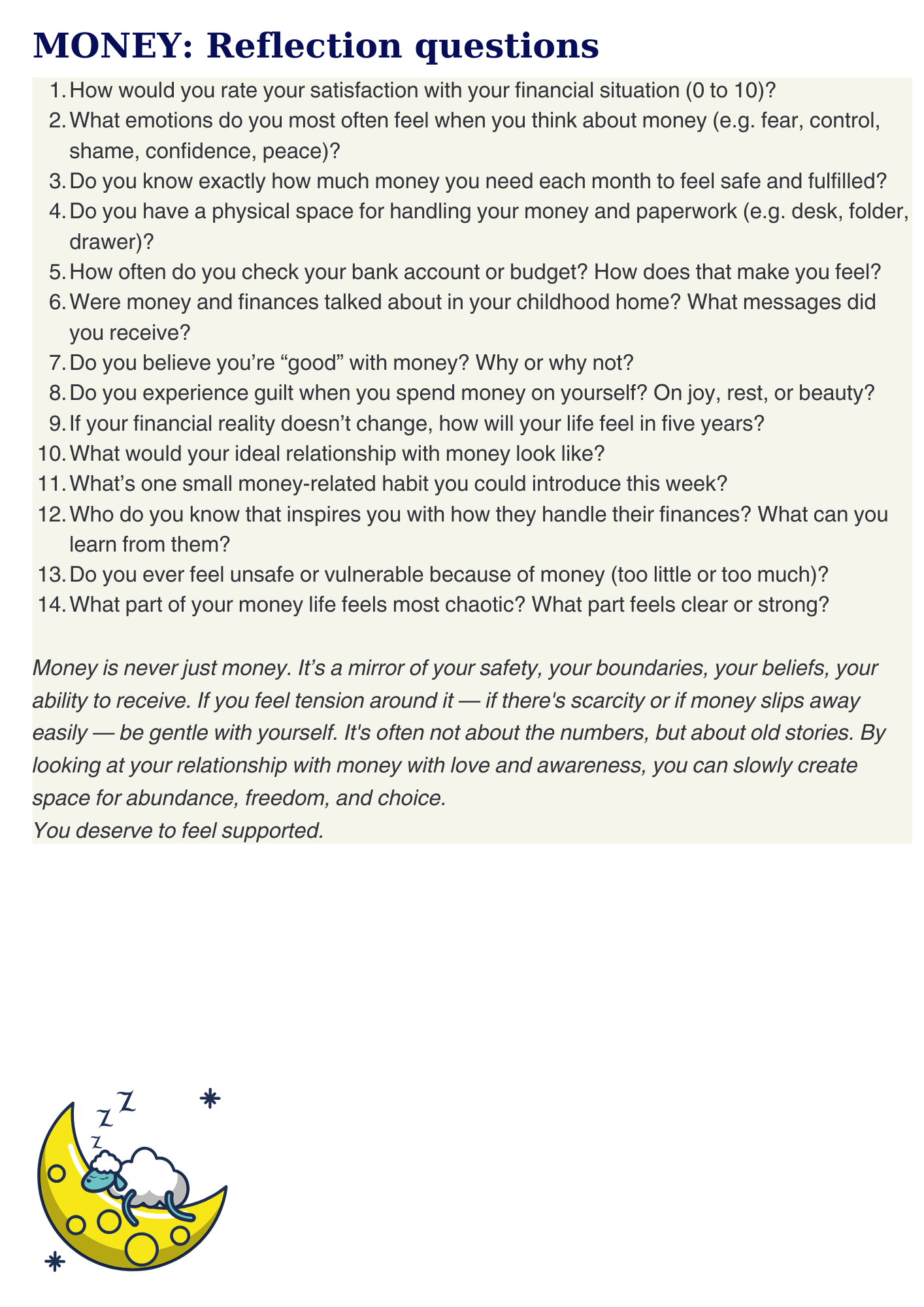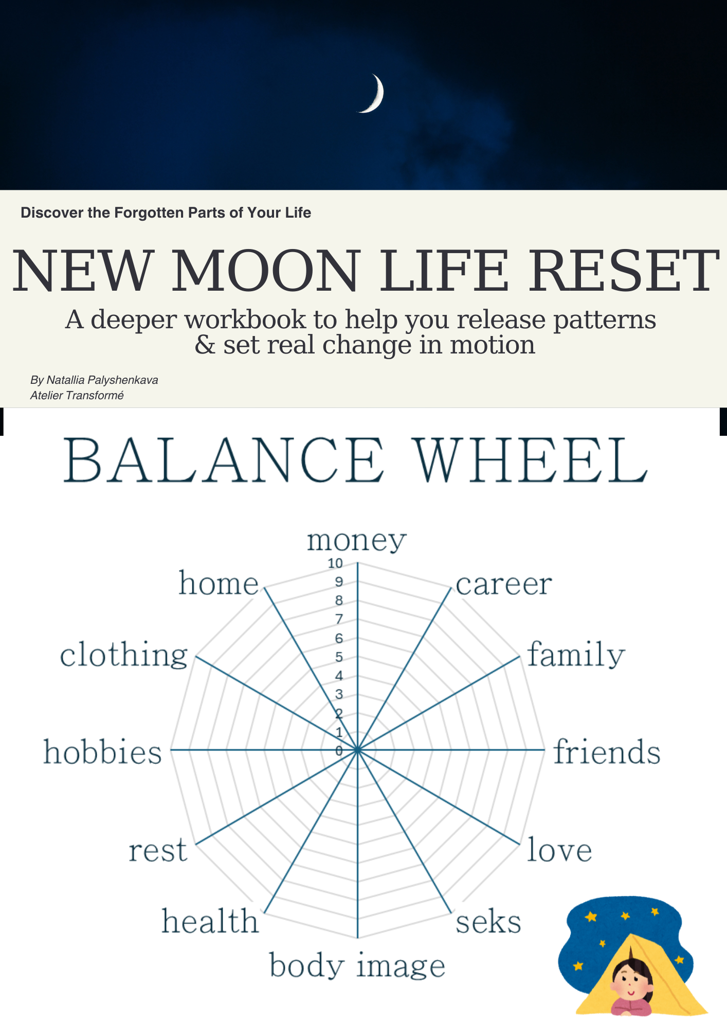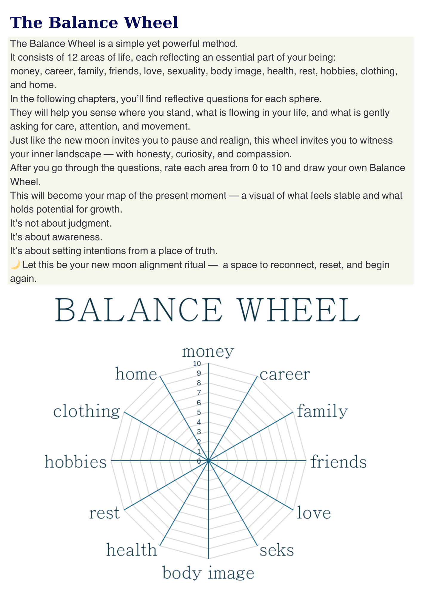 You’ll explore 12 key spheres of life — from money and health to relationships, sexuality, rest, and self-expression — using deep, simple New Moon journal prompts.