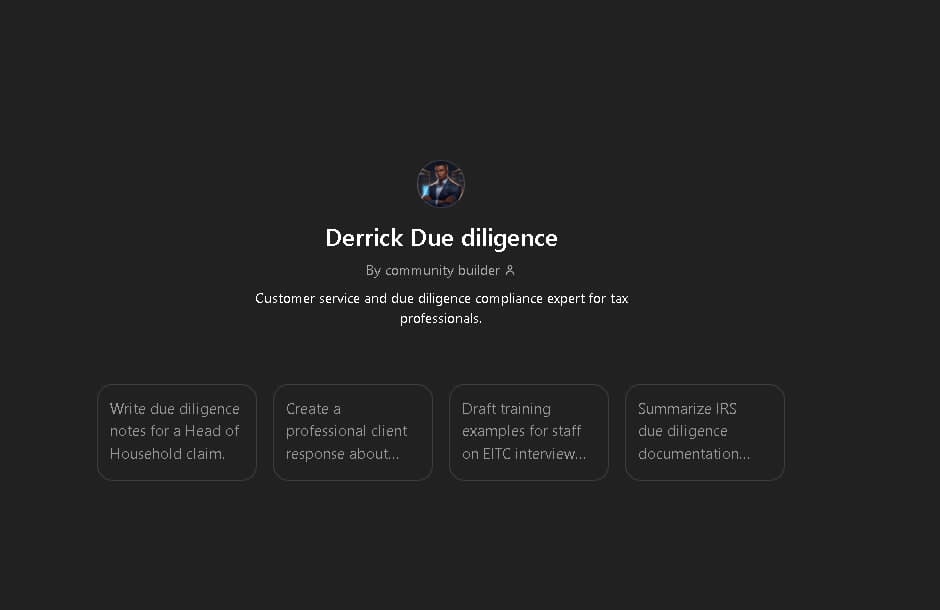 Enhance your tax preparation process with Derrick Due Diligence ChatGPT AI! 🤖💼 This powerful AI tool assists tax professionals in conducting accurate, compliant, and efficient due diligence interviews. Save time, reduce errors, and ensure every client file meets IRS standards with ease!