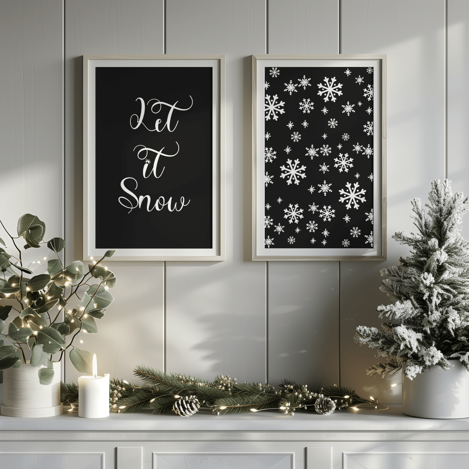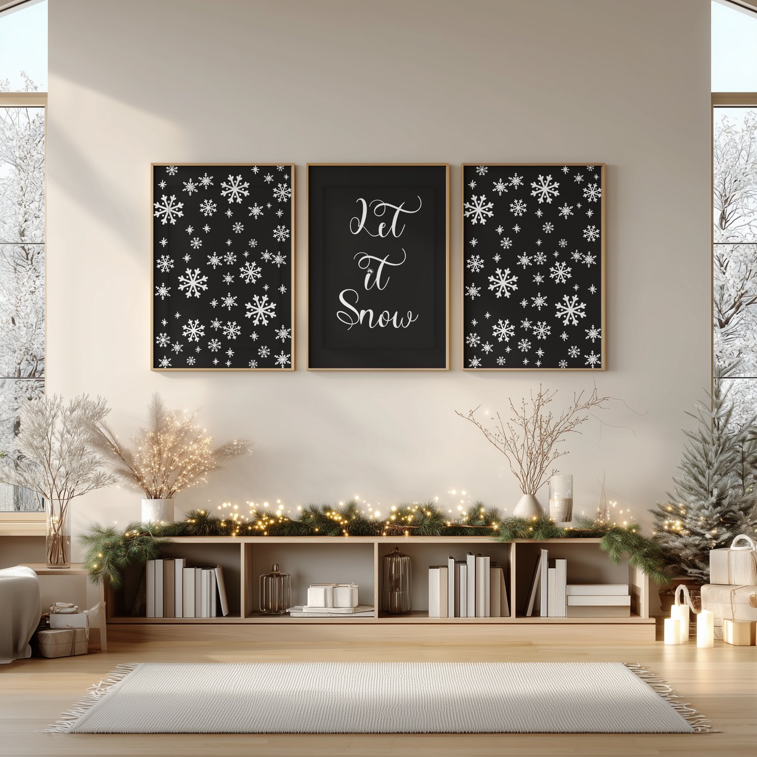 Black and White Let It Snow Print Set, Minimalist Christmas Wall Art, Snowflake Winter Decor Printable Holiday Home Art (Digital Download)