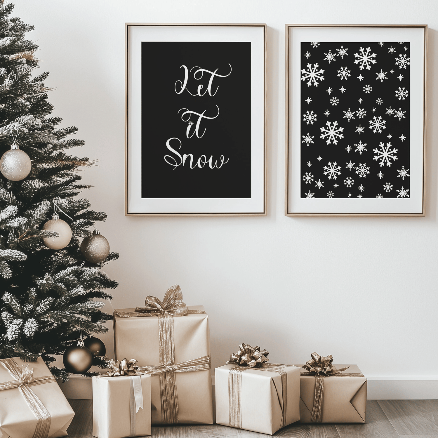 Bring a cozy winter touch to your home with this elegant black and white Let It Snow wall art set. Featuring modern script lettering and a coordinating snowflake print, this set is perfect for living rooms, entryways, holiday party décor, and seasonal gallery walls. The classic black background with crisp white design makes it easy to match with any décor style—from farmhouse to modern minimalist.