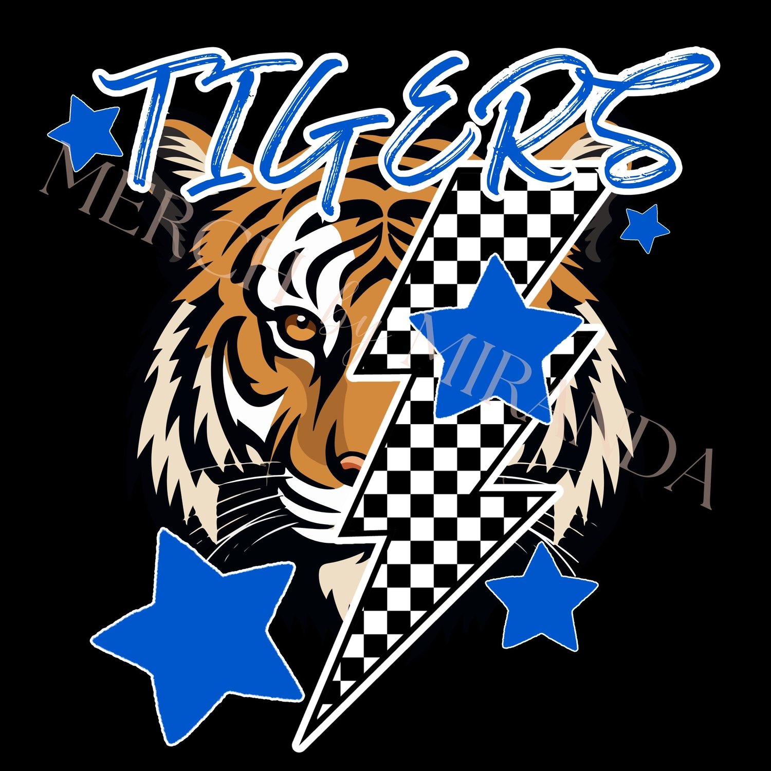 Tiger Mascot Blue | Sublimation Design | Digital Download | School Spirit Shirt PNG | DTF Design | Lightning Bolt-Checkered with Stars - Raiders - Tigers