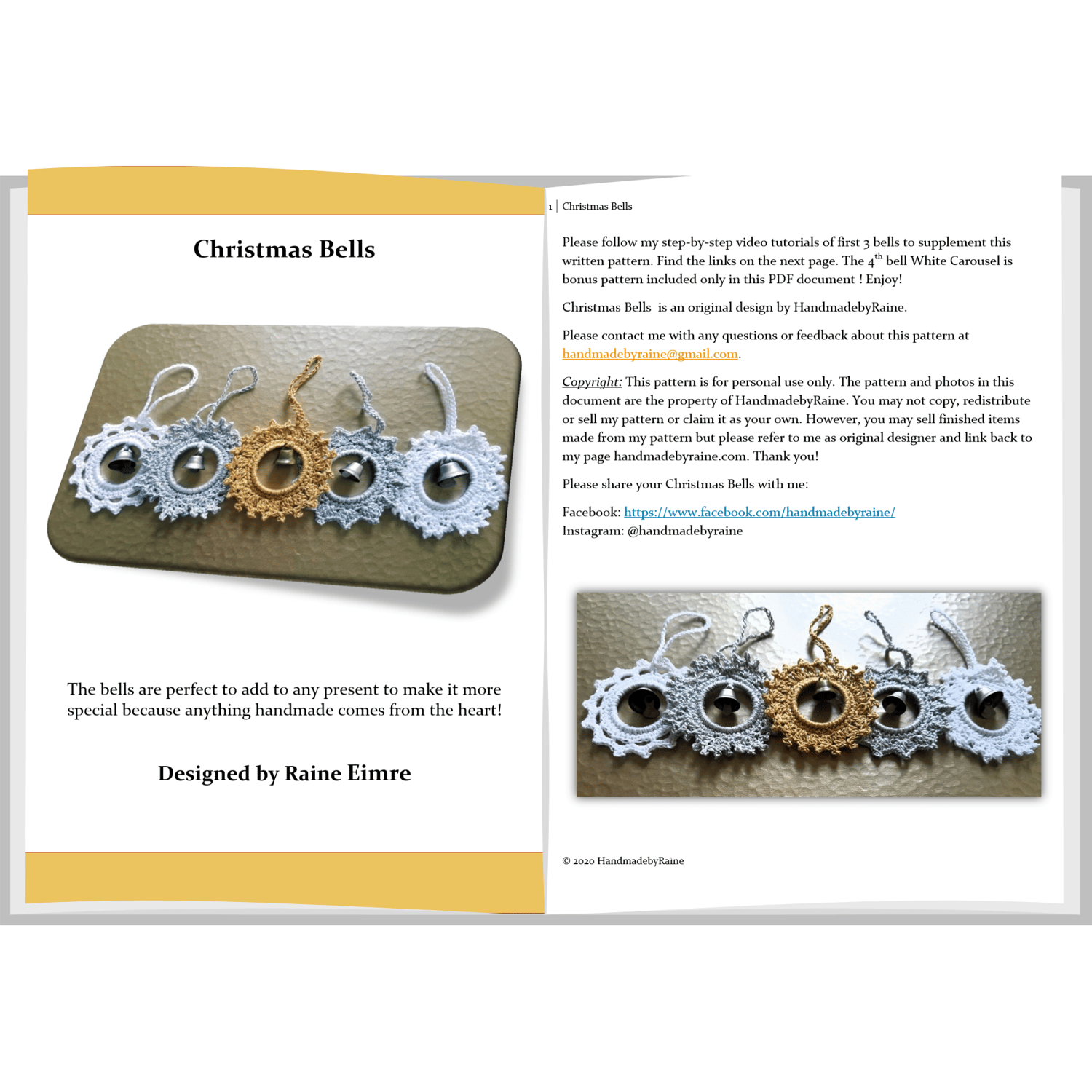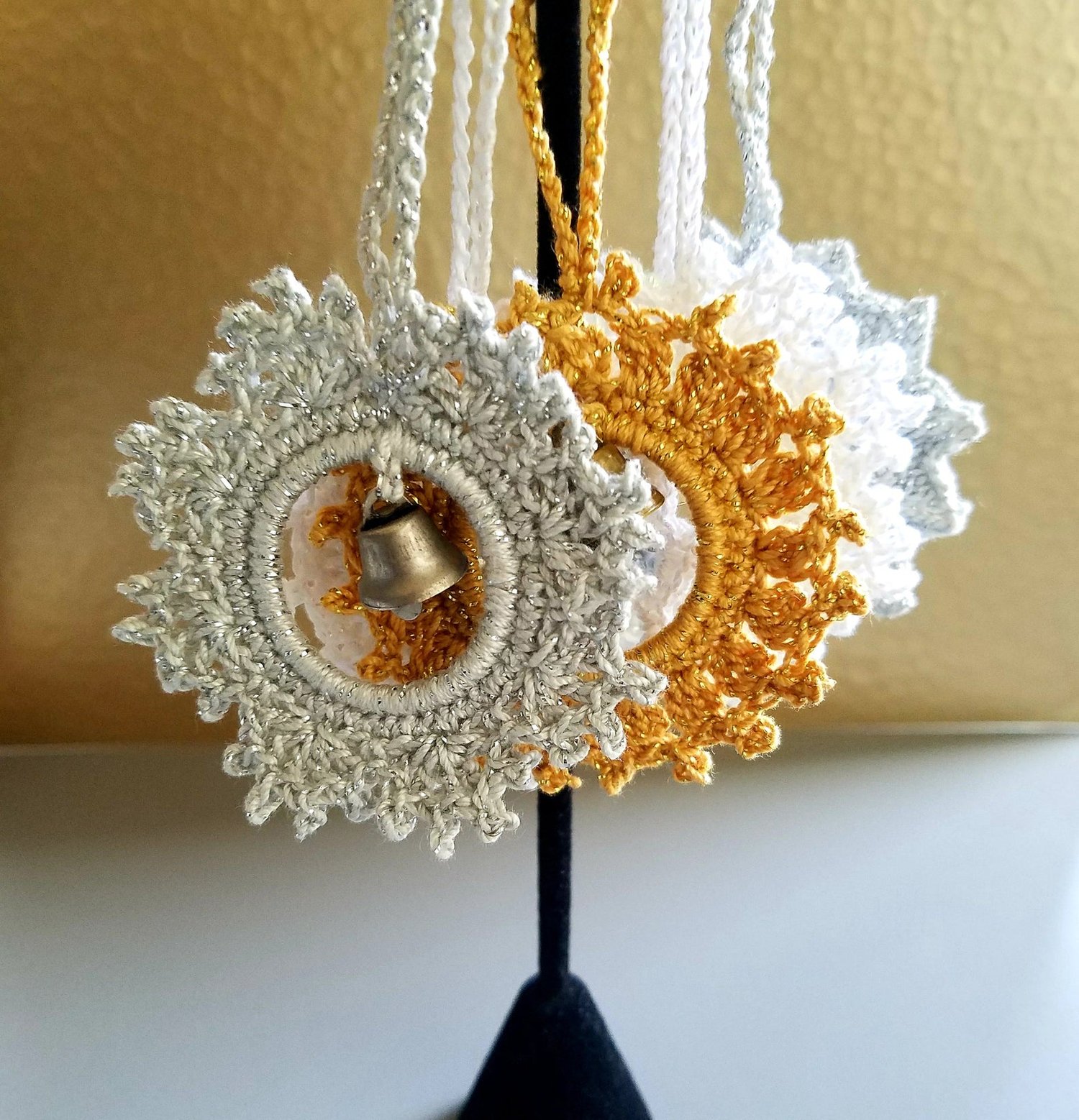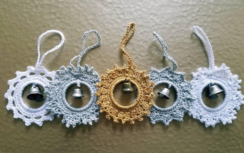 4 beautiful Christmas Bells - Silver Star, Golden Sun, White Snowflake and bonus pattern included in PDF only - White Carousel!