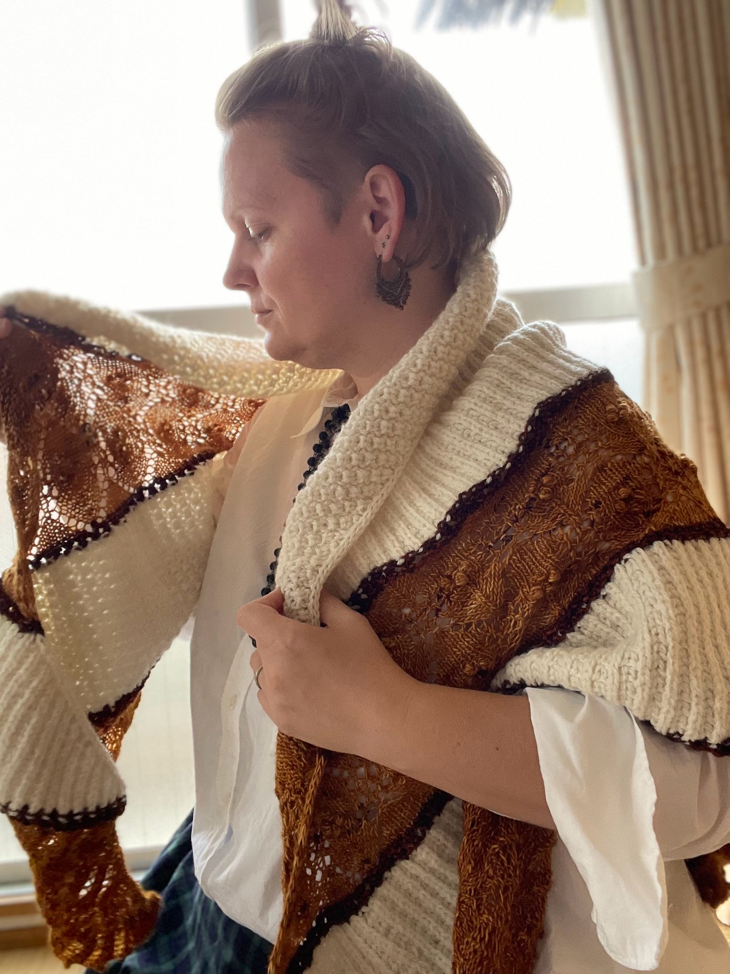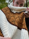 The intricate lace panels are framed by fluffy Tilde Brioche, a beautiful variation of the standard brioche rib.