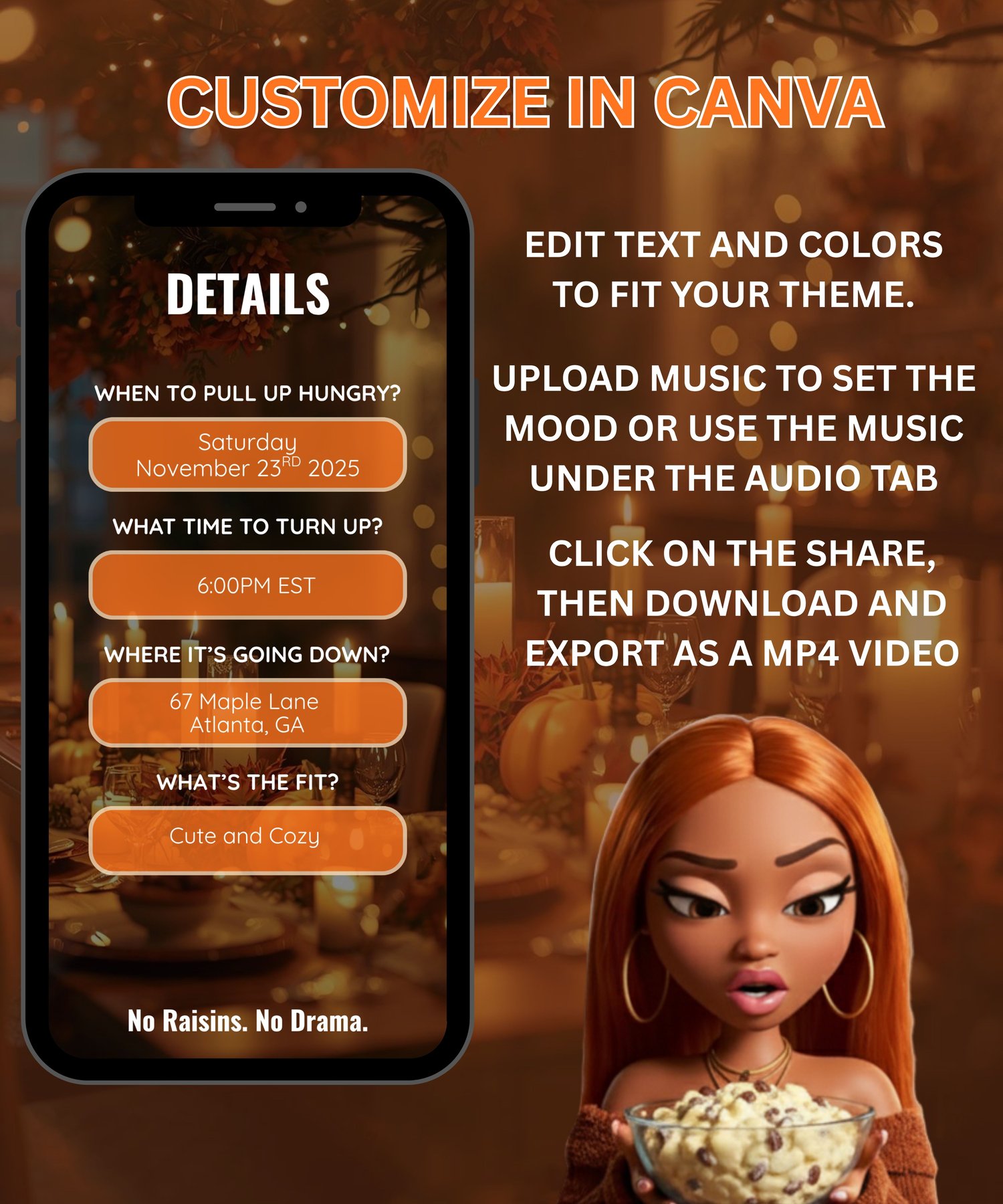 Your Friendsgiving just got upgraded. This animated invite serves it all: laughs, looks, vibes, and a stand against raisins in potato salad. It’s more than an invite; it’s an experience your crew won’t forget.