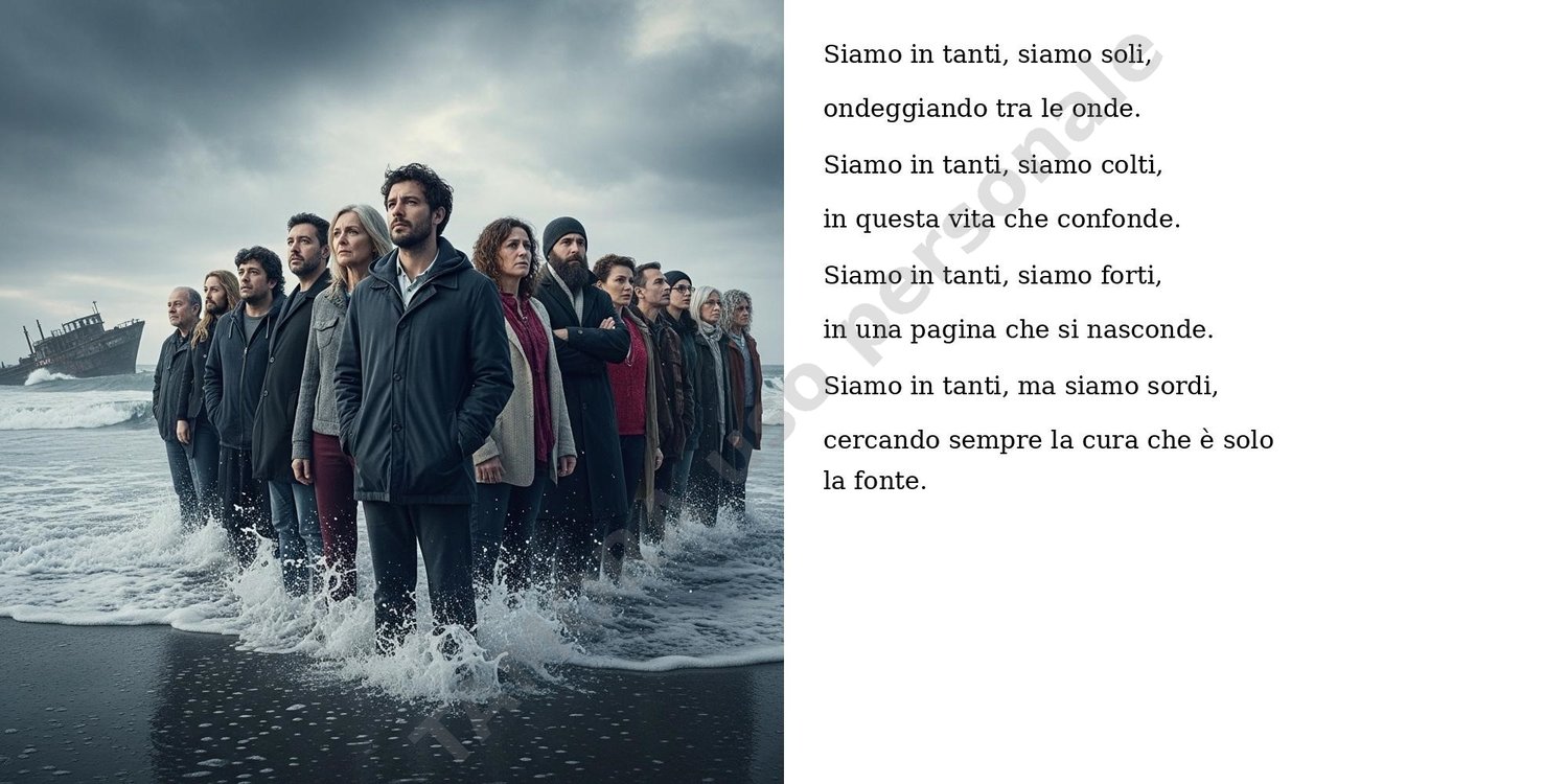La riva del mare fa da sfondo a un gruppo di persone allineate, immerse in un’atmosfera intensa e carica di significato. Onde di solitudine è una cartolina poetica digitale che esprime la sensazione di sentirsi soli pur essendo in mezzo agli altri. I versi originali accompagnano l’immagine evocativa, invitando a riflettere sul senso di comunità e sulla ricerca interiore di una “cura” che risiede nella fonte. Acquistando questa cartolina digitale, riceverai immediatamente un file JPG ad alta risoluzione e un PDF pronto per la stampa, per poter apprezzare o regalare questo messaggio poetico.