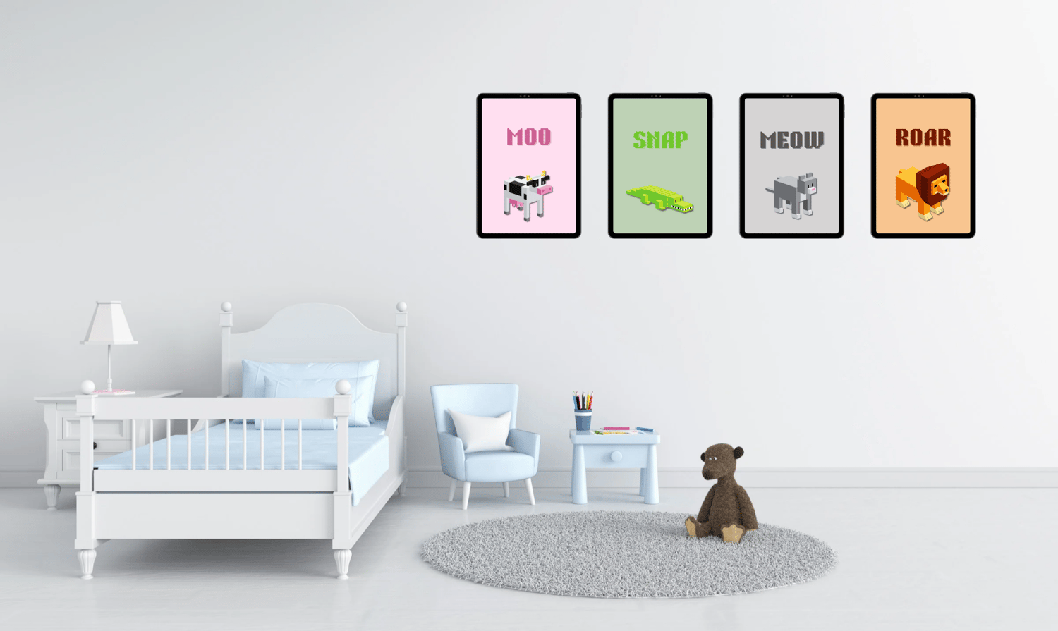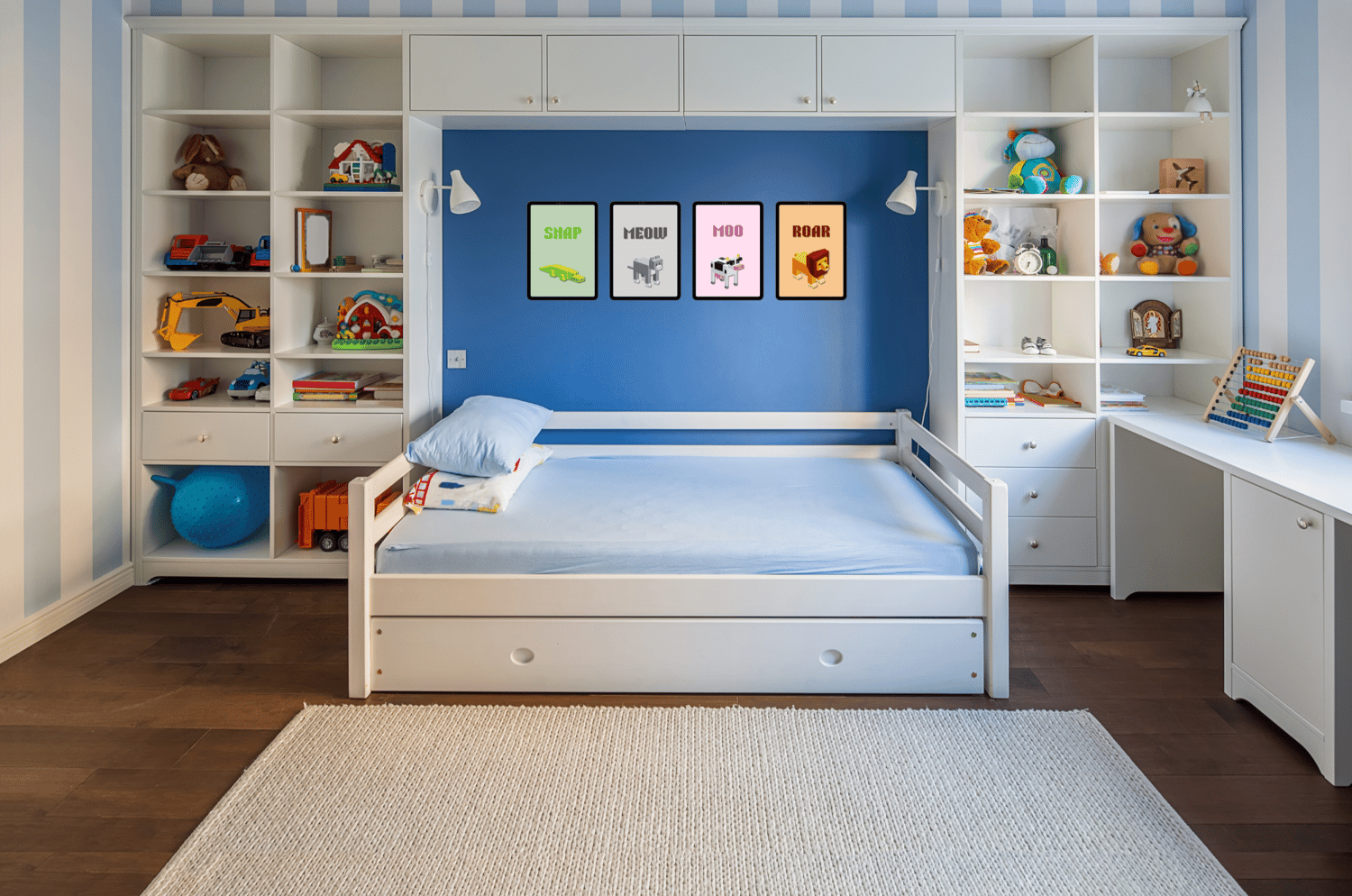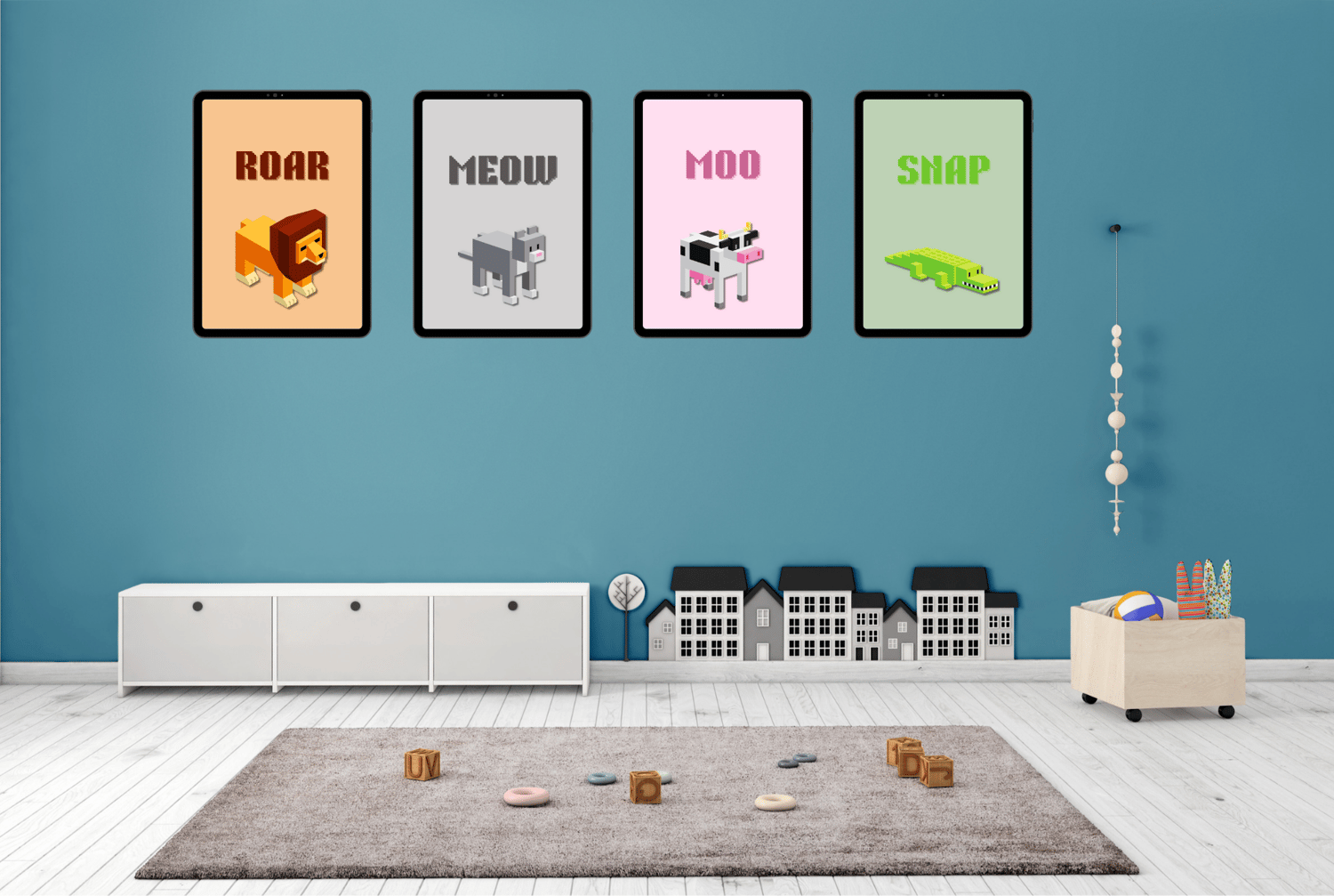 This bold, blocky collection brings Minecraft vibes into your decor. Perfect for little gamers, it includes four pixel-style animal prints in fun, earthy tones that match seamlessly.