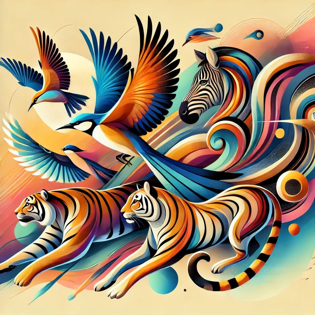 "Prismatic Wildlife" is a vibrant and dynamic digital artwork that showcases the beauty of nature through an abstract lens. Featuring an array of colorful birds in flight alongside striking depictions of big cats, this piece captures the essence of wildlife in a captivating blend of shapes and colors. Perfect for nature lovers and art enthusiasts alike, it adds a bold and energetic touch to any digital collection or space.