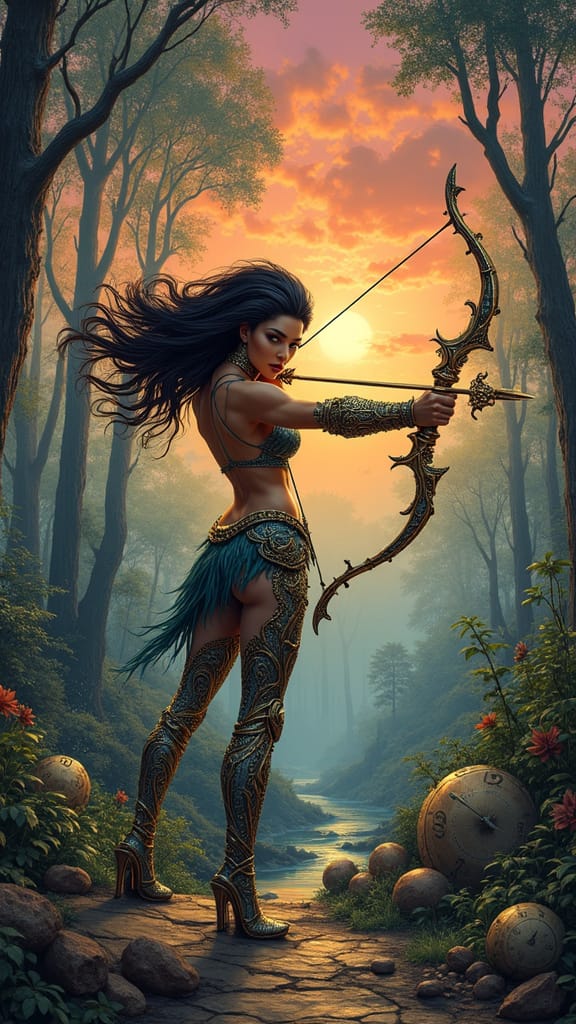 A surreal image of an Amazon warrior with a serpent bow in a dreamlike forest. This artwork features melting foliage, impossible colors, floating clocks, and cracked earth in a surrealist style.