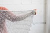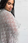 The Beaconsfield shawl is a wide rectangular wrap in three sizes, worked flat from the short end. The shawl begins and ends with several repeats of Horseshoe Lace pattern, transitioning to English Crystal Lace in the middle for the majority of the shawl.