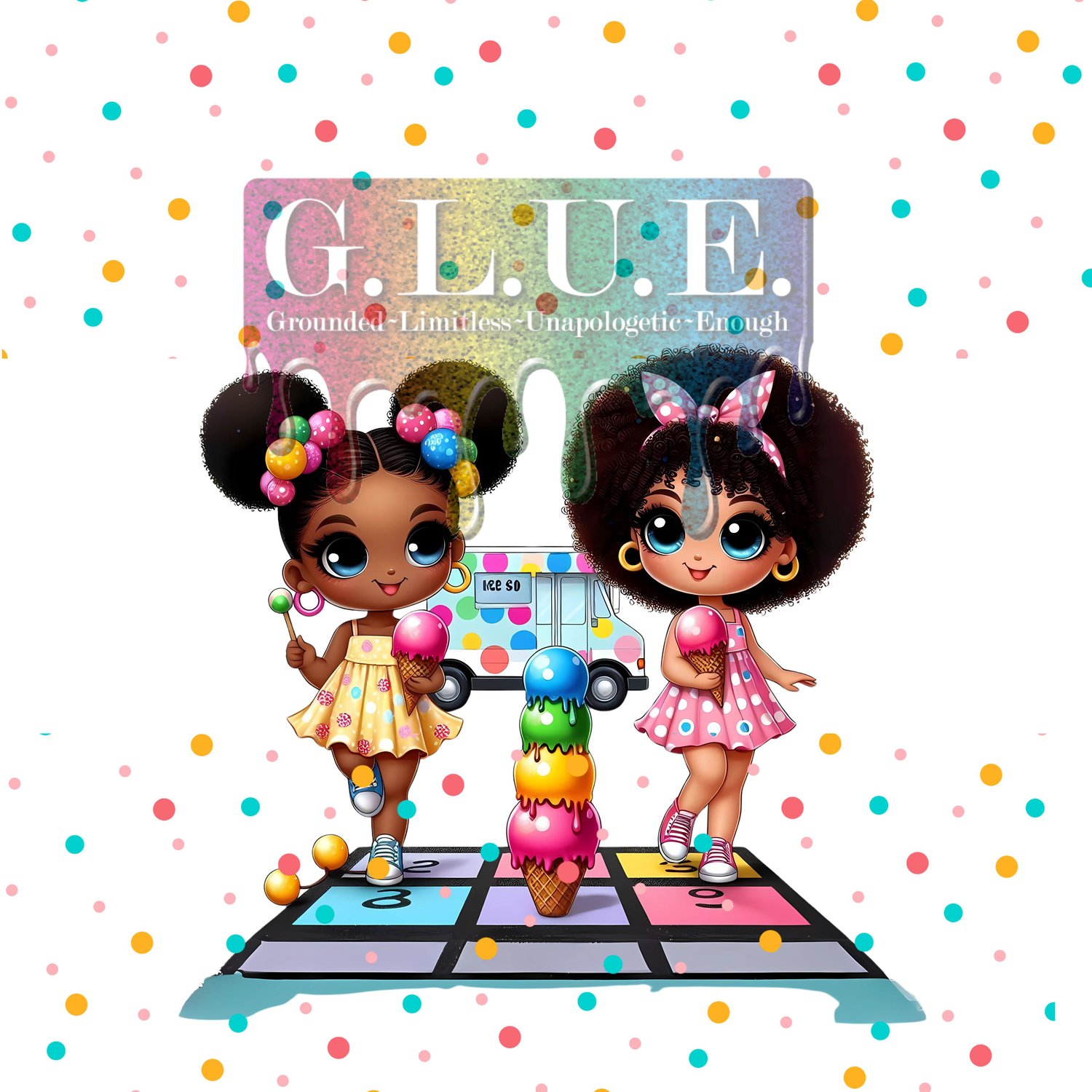 Bring sweet joy and childhood charm to your projects with this vibrant high-resolution PNG featuring two adorable little girls with big hair, big eyes, and even bigger personality! Dressed in colorful polka dot outfits and rocking ice cream cones, these besties are having fun on a hopscotch mat with ice cream trucks in the background. Their oversized bows and bright sneakers add a playful touch, making this design perfect for kids’ T-shirts, birthday invitations, classroom decor, party supplies, or sticker sheets.
